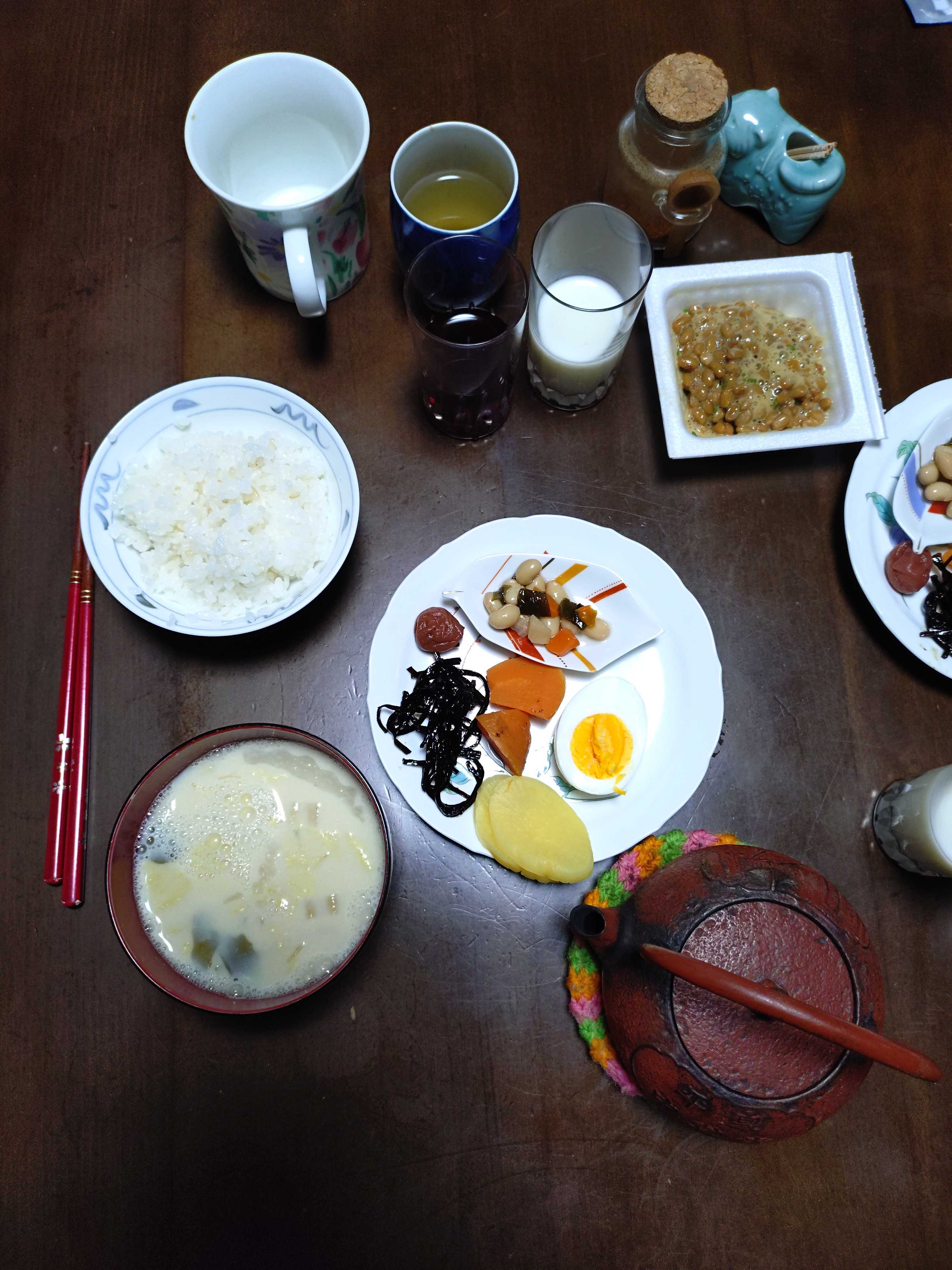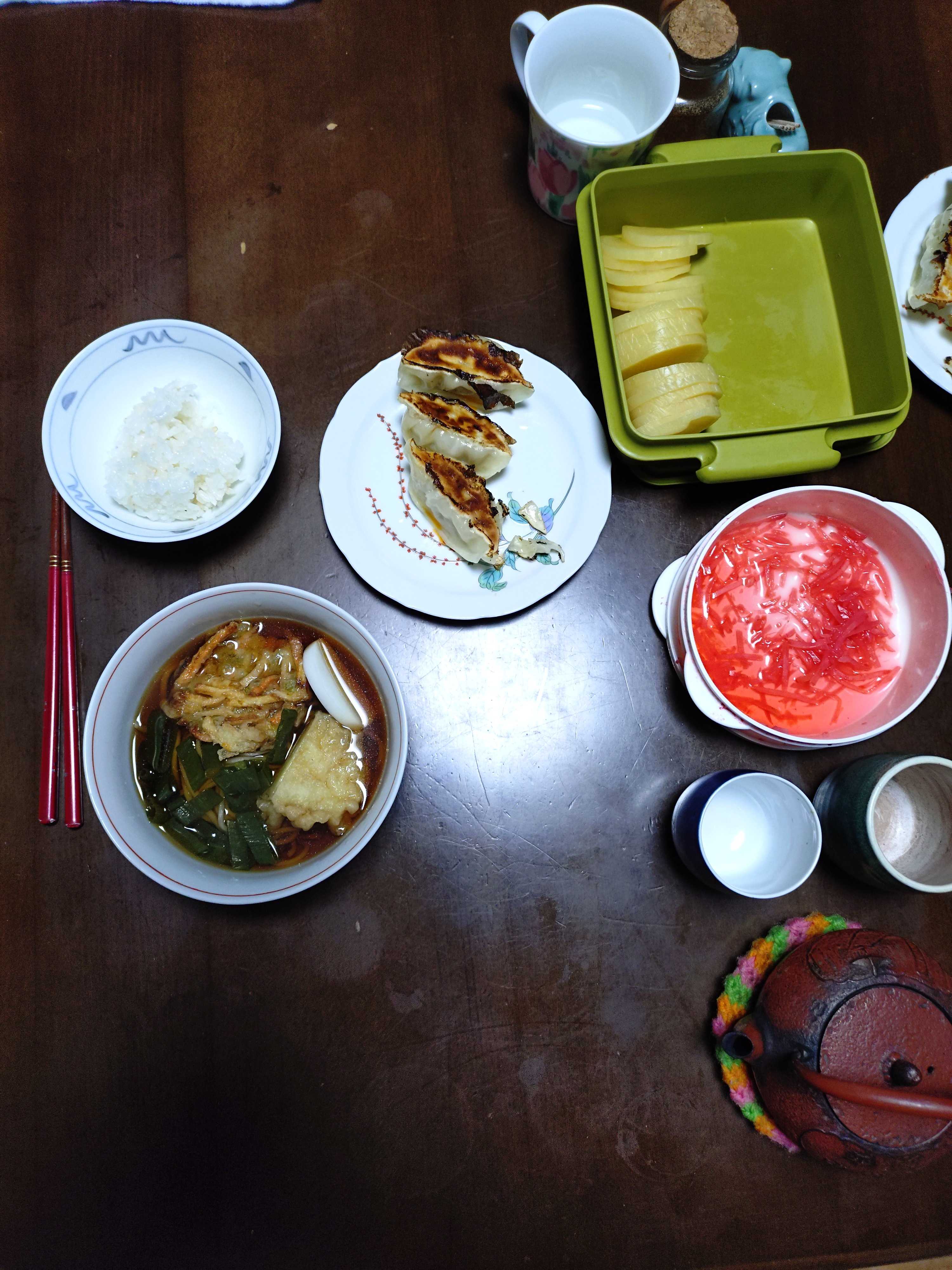 納豆 半分ずつ 茹で卵 沢庵 茹で人参 昆布つくだ煮 梅干し 煮豆 ご飯発芽玄米入り 味噌汁豆乳仕立て夕食 沢庵 紅生姜 焼き餃子 ご飯発芽玄米入り 少量 日本そば 天ぷら載せ高市自民党総裁 煎餅