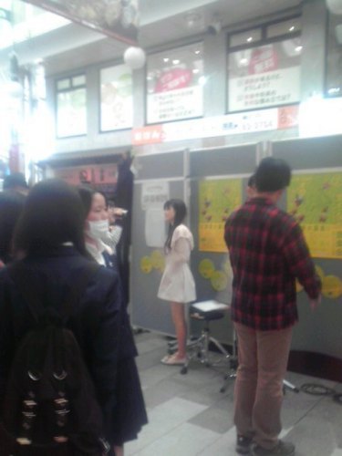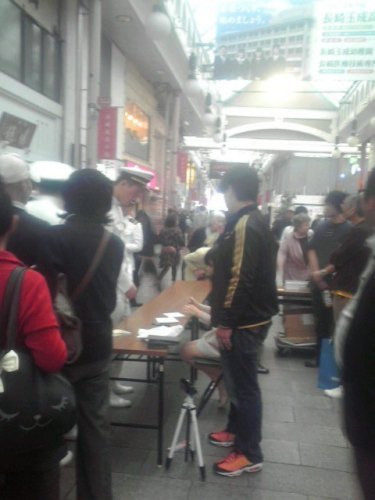 で、音楽会終了後、そのまま、握手とサイン会へ。この会場に物販コーナーが設置してあり、あさひちゃんのCD、DVD購入者にはもれなく、ということでした。私も、DVD(satoyamaのMVだよ。)を1枚買って参加しました。いやさ・・、私、今回も、CD、DVDのジャケットにサインするんだと思ってたからさ・・。前回の長崎駅前広場のイベントの時、CD2枚買って、そのジャケットにサインしてもらったのを持ってるからさ、同じものを貰ってもしょうがないから、じゃあ、今回はDVDのジャケットがいいかな、と思ってさ、買ったのにさ・・。なんと、今回は、小さい色紙にサインしてくれたんだわ。なんともはや・・、じゃあ、1000円のCDで良かったじゃねえかっていうね・・。3000円のDVDを買っちまったぜ・・。まあ、御丁寧に色紙を用意してサインして貰えたっていうのは、もちろん、すごく嬉しかったけどね。東京とかのイベントでは考えられないくらい、各人、握手して、会話して、サイン書いて貰って、また握手してっていう、すごく丁寧な対応だったわ。まあ、地方だしね、東京イベほど人は多くはないだろうから可能なんだろうけどもね。それでも、50~60人くらいは行列してたね。長崎以外のところから、わざわざ遠征して来たんだろうなあって、見ていて分かるような、熱心なファンの方々もいましたね。(だって、前回の長崎駅前イベでも見かけた人達だったからね・・、これから帰る、飛行機がどうのこうの・・、みたいな会話もしてたしね・・。)なんか、あさひちゃんの親戚の方々とか、お友達とかも、見に来ていたみたいだったわ。1人で、CDを10枚買った、とか言ってたおばちゃんもいたし、おそらく、そうなんでしょう。この、握手&サイン会は、1時間弱ほどで終了しました。まだ、書くことがあるので、続きます。あ、ちなみに、写真に写ってる、白い制服の男性たちは、たまたま、このイベントを通りすがりの、韓国人たちでした。制服の名札がハングル文字だったからね。韓国海軍なのかな、練習航海とか・・?、よく分からんけども、まあ、長崎は、一応、国際的な港町なんでね、立ち寄ったのかもね、さもありなんって感じだな。