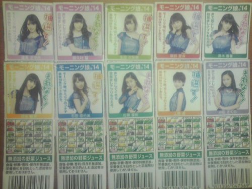 現在、モーニング娘。’14が、TVコマーシャルに出演しております、カゴメの「野菜一日これ一本」でございます。当然、皆さんも、ご存知ですよね。この、モーニング娘。’14キャンペーンが始まってからは、私も、出来る限り、コレイチを買うようにしております。それまでは缶コーヒーばっかりでしたが、最近はコレイチばっかりですので、なんだか、少し健康になったような気がしております。で、早くも、メンバー全員分のパッケージが揃いました!飲み終わった後で中を洗って、この部分だけ切り取りました。まだ、そんなにたくさん買ったというわけでもないんだけれども、上手いこと店に置いてあったのでね、運が良かったね。嬉しいです、ささやかな喜び・・・。