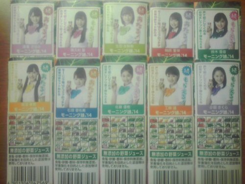 前回、大好評であった、KAGOMEのモーニング娘。コップのフチ子キャンペーンですが、その第二弾でございます。よほど評判が良かったのでしょうね、早くも再び、しかも規模を拡大して実施されておりますね。皆さんも、すでに御存知のこととは思いますが。と、いうことですので、今回も、私、微力ながら、協力するつもりです。で、前回もそうしましたが、今回も、全員分のパッケージを集めようとしましたら、何軒かの店に、上手い具合に置いてありまして、早くも、全員分揃ってしまいました。ちょうど10個しか買ってないのに、全10名分揃うって、運が良いというか、本当に無駄が無いですな。まあ、キャンペーンは、まだまだ始まったばかりなので、この後も、こつこつ買いましょうかね。今回も、日本全国で、大盛況であることを願っております。