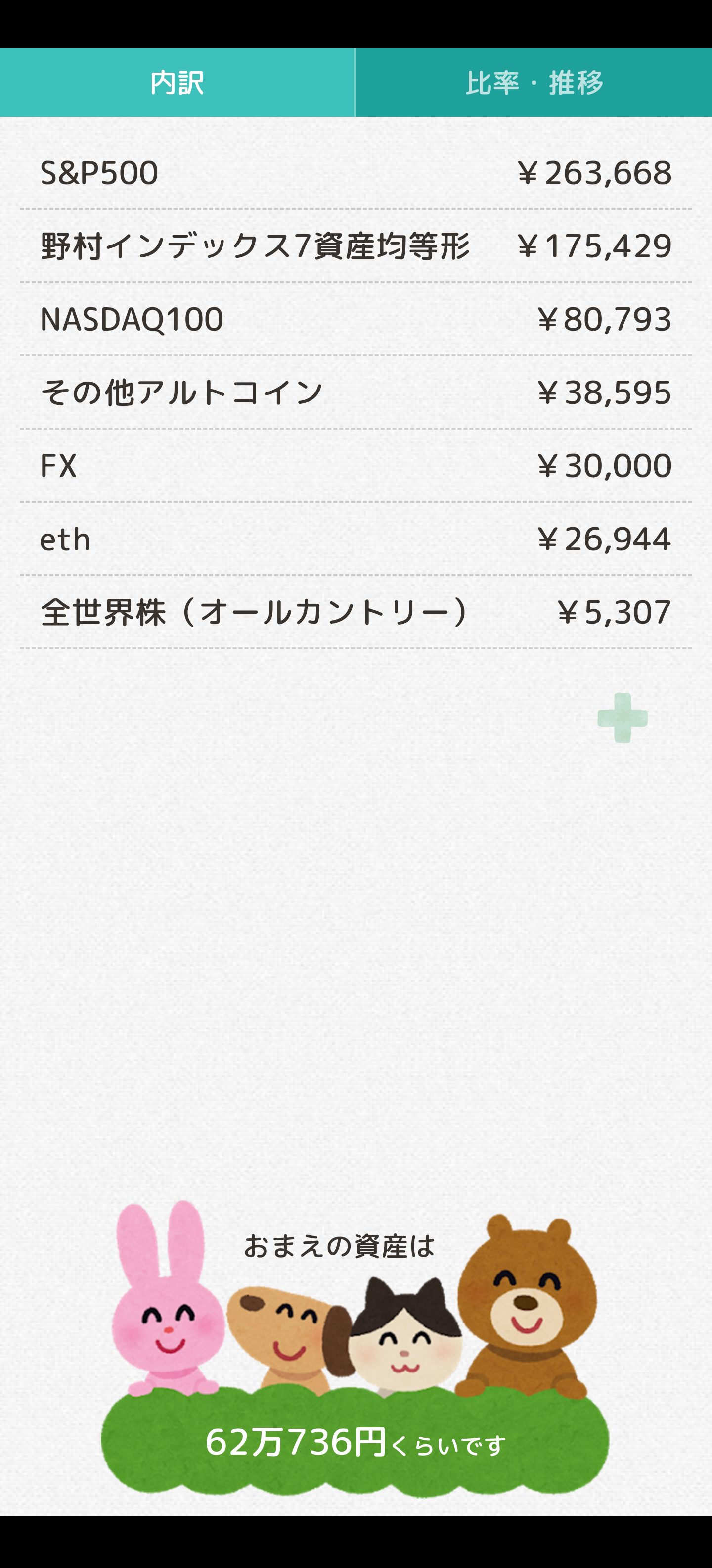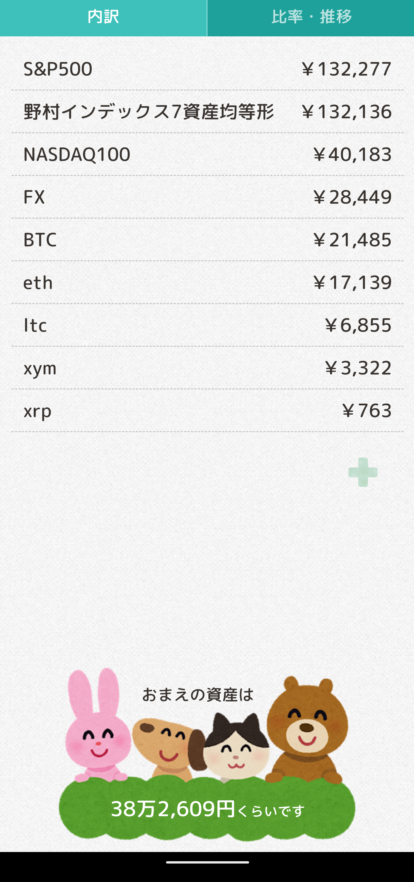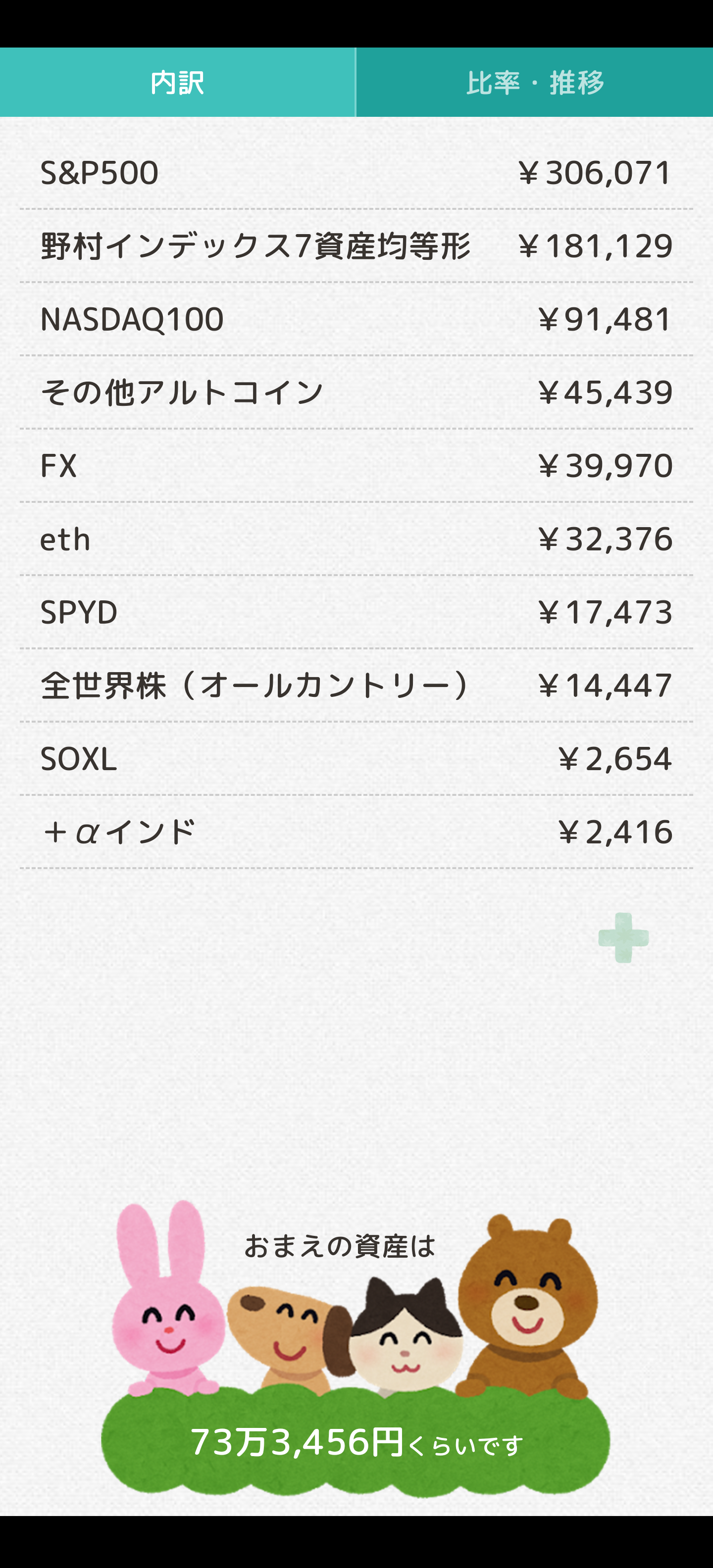 本日はブログ2日目なので今現在の資産を書いて見たいと思います。(積立NISA)SBI・V・S&P500インデックス118284円 含み益+25378円野村インデックス内外7資産バランス125051円 含み益+15646円(その他積立)NASDAQ100インデックス29808円 含み益+2007円暗号資産48000円 含み益+13000円積立NISAは3年程継続していますがまだまだ満額とはいかないですね(。•́︿•̀。)FXも少額ですが少しづつ頑張っているのでそちらの収支も定期的にご報告していきます。派手な投資はできませんが同じような会社員の方も沢山いらっしゃると思いますので少しでも多くの方と共有していければと思います(人 •͈ᴗ•͈)貯金感覚でできる3000円投資生活DELUXE
