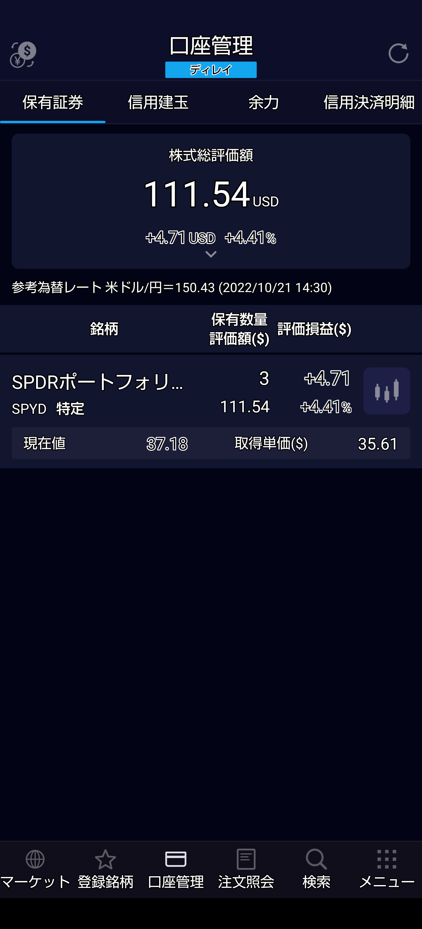 こんにちは。少額投資の元パチンカス一般人が50歳までに3000万を貯めることを目標にそれまでの過程をただ記録していこうとするブログです。のんびり見て頂けると幸いです。今回は今月から買い始めた投資について書いていこうと思います。今月からSPYDと+αインドをポートフォリオに加えて積立していくことにしました。まずはSPYD。運良く今月の底辺りで3株だけ買えました。15000円分ぐらいです。1度ドルに変えて買わないといけないので円安の今買うのはどうかと思いましたが円高を待っていて株価が上昇していたら同じことなので気にせず購入しました。SPYDはアメリカの高配当ETFとして人気な商品です。平均的に1株辺り年間4%ぐらいの配当利益が見込めるのでこちらは単純にインカム狙いでこれから少しづつ買っていこうと思います。つみたてNISAの投資信託だと値上がり益は期待出来てもインカムゲインでの福利効果は狙えないので別の角度からの投資のつもりで期待しています。次は+αインドです。インド株全体を買えて手数料も今まであった投資信託に比べればかなり格安になっている商品。インド株はずっと興味のある分野だったのですが手数料が高いというデメリットがあり投資を避けていたのですが今年の夏頃+αインドが発売されたということで少し遅くなりましたが購入してみました。他の投資信託よりは少額ですが積立ていこうと思います。インドは少子高齢化の日本とは真逆で人口増加している国で今子供世代がかなり多いとのことです。単純に考えれば10年後20代30代の働き盛りが増えれば会社も潤うだろし若い世代が増えることで購買力も上がるので株価も上がると思っています。今現在でももうインド全体としては上がりだしていますしね。ただ中国バブルがそうであったようにアメリカほどひたすら右肩上がりかと言われるといつか下がる時がくるかもしれないので注視しながら少額買っていきたいと思います。以上が今月から追加で積立投資を始めた銘柄です。次の投資資産の公表のときにはこれらも含めたポートフォリオを公開していこうと思います。数年後この2つの投資が実を結べばいいな。今回は以上になります。次回は11月の最初辺りに2022年10月末現在のポートフォリオと資産額を公開する予定です。また読んで頂けたら嬉しいです。