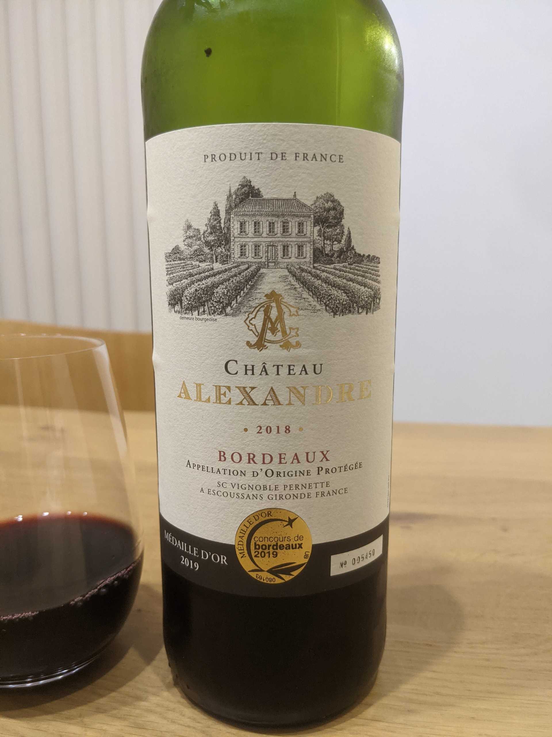 シャトー・アレクサンドル 2018 CHATEAU ALEXANDRE AOC:BORDEAUX 格安ボルドーも残り少なくなってきました。 先日カレーを作ったのですが、普段カレーには赤ワインを入れてに煮込むのですが、料理で使っている紙パックのワイン(料理用のワインではないのですが)を切らしていたので、このボトルを開栓しました。 コク薄め、果実味あふれる飲みやすいワインですね。最初、口に含むとほとんど苦みを感じないのですが、後味にじわっとタンニンがきます。 チャーミングなワインですね。