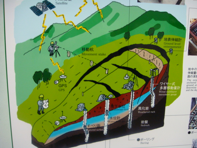 東部治水東部治水で柏原市へ視察に行きました。国内最大の地滑り防止のための治水治山工事をしている地域です。生駒山脈の南の端に、奈良県から大和川が流れていますが、地滑りが起こると、川をふさぎ 行き場を失った水が奈良盆地に溜まり水害を起こし、さらに溜まり続けて地滑り部分を超えると、今度は溢れた水が大阪平野に氾濫する、大規模な水害を起こす危険地域です。かつて幾度も地滑りが発生し、河川氾濫・鉄道寸断・国道閉塞が引き起こされたり、斜面に住んでいいた人たちやブドウ畑にも多大な被害があったそうで、当時の写真展示もありました。工事の主な内容は地滑り面に溜まっている水を抜き取り地滑りが起こりにくくすると同時にGPSや、地表伸縮計などによる観測を強化して被害を小さくするためのものです。地域内にはすでに縦横に水抜きのためのトンネルや井戸が掘られていますがその中を見学したりしました。今日は朝から雨が降り、現地に着いたときがピークでしたが、ガイダンスを受け、スライドを見ているうちに雨はあがりました。それでも足元がぬかるんでいるからと、長靴を貸してくれたのですが、私のサイズ(28センチ)があるかどうか、不安でしたが、なんと!ありました。 亀の瀬という地名だけに、トンネル入り口のモチーフも亀でした。暗い坑道にはライトがありませんので、3人に一つ程度の懐中電灯を持ってぞろぞろと歩いて行きました。地下水からの排水パイプの先が、トンネルの天井や壁に顔を出し、そこから絶えず水が出ています。 この水はお昼近くまで降っていた雨ではなく、晴天でも流れているそうです。視察を終えて市役所へもどり、議員団会議、新聞赤旗日曜版の仕分け・配達。それらを済ませてから夜の会議に出ようとしていましたが、地域の方の通夜があるとの連絡を受けたので、ご焼香をしてから会議に出席しました。