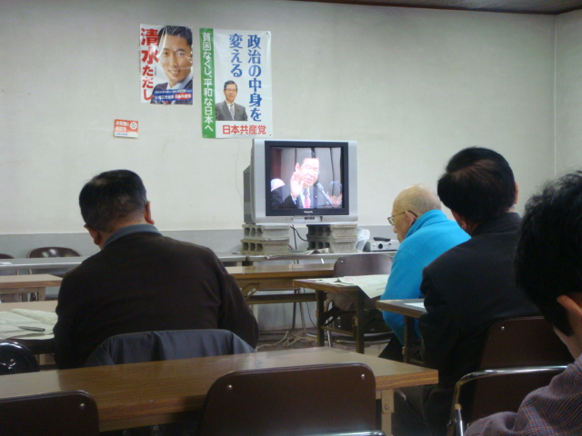 第25回党大会始まる午前中は建物の測量や、家屋の傷み具合などを専門家を呼び、診断してもらいました。と言っても、バンド仲間が1級建築士なので彼に無理を言って、協力をしてもらった次第。今まで、事務所として使ってきた建物だが、リフォームか、建て替えかなど、悩ましい問題に断を下すためにも必要な診断を素人判断は禁物と専門家のアドバイスを必要としていたのだが、結論は「極めて危険な状態」かつて、シロアリに侵されて、柱の補強などで切り抜けてきたそうだが、家を支える柱の強度が足りない状態で、地震が来たら倒れてもおかしくないと言う。不安的中で、今後の対応が大変そうだ。昼からは、日本共産党の第25回党大会のCS放送を見るために守口市まで走った。冷たい北風に交じって、雪がヘルメットについたフードにぶつかってくる。粉雪のように、服についてもすぐには融けださない。気温が低いせいだろう。 大会1日目の今日は、志位委員長の幹部会報告が放送されていた。手元に配られた資料を見ながら、志位委員長の話を聞き、メモをとる。約ひと月前に発表された大会決議案の、基本的中身は殆どそのまま、その後の情勢の変化を補足したり、強調したり。また、この間の全国的な討論から出されてきた、疑問点なども大会を通じて討論が行われることになる。日本共産党は、一人ひとりの党員が、直接中央委員会や党幹部などに意見を言ったり、質問をすることができるので、大変な量が終結したと思う。大会は16日まで行われ、その後各都道府県会議を経て地区党会議、支部会議などで、決議を再び討論しながら方針を出して地域に生かした実践へと高めていく。しっかりと討論に時間をかけ、徹底した討論により導き出された決議を実践という立場で読み解いていく。党綱領の具体化と言えなくもない。明日からは、膨大な文書がしんぶん赤旗に掲載されることになるが、いち早く読んで、かみ砕かなければならない。身につけるために!