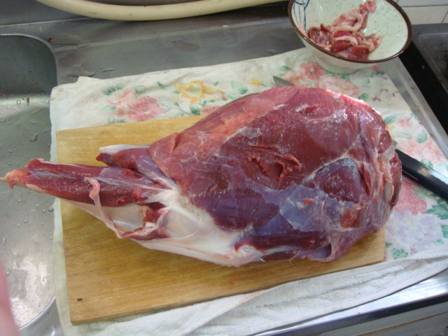 シカ肉を解体・調理午前中は地域の訪問をして新聞赤旗の購読やポスターの掲示をお願いして回りました。快く貼らせていただくことになったお宅の塀はおおや石でできていて、両面テープでは、その粘着力が心配でしたが、何とか貼る事が出来たり、板張りをしてから針金などで吊り下げたほうがよいお宅には、許可だけいただいて後日貼りだしに行くことにしたりと、段取りに不十分な点がありましたが、思っていた以上に好意的にポスターを張らせていただけました。昼からは、先日Kさんにいただいたシカ肉をもって「かがやき館」へ。午後3時から歴史の講演会があり、終了後に参加者で鍋を囲もうという訳です。シカ肉は、太もも、丸々1本!古崎市議が昨日、冷凍庫から冷蔵庫へ移しておいてくれたので、ほぼ解凍されていますが、中心部の骨の周りは凍ったままでした。薄っぺらな包丁は、刀身と柄がガタついて、切れ味も悪いものしか見つからず生食用の薬味にネギやしょうがのみじん切りを大量に作ることを考えるとかなり不安がある代物でした。が、これしかなければこれでやるしかありません。 筋の部分はどんぶりに取り分けて、あとで骨と一緒に煮込みます。 格闘の末、肉を切り分けて、まとまったブロックから刺身用にスライス。大量の葱・生姜・ニンニクを山盛りにして醤油をかけました。残りのお肉は切り分けて、鍋用にと、別の皿に盛り付けどうにか解体成功です。骨を砕いて筋肉とともにだしを取りながら、ジャガイモを蒸かします。 これもおいしそう!ここまでで、約3時間半もかかってしまいました。冷たい肉を触り続け、腰をかがめて作業したので、腰や肩がかなり疲れときどき背伸びをしながら続けました。私の身長は183センチと高いので、我が家の台所には20センチほどの厚さのあるまな板を置いて料理をしています。子どものころに庭に植えた銀杏から育ったイチョウの木を母が死に東京から離れるときに太さが40センチほどになっていたのでまな板に加工して、兄と二人で分けたものです。だからいつもは台所仕事は苦にならないのですが、背丈の低い台所ではたちまち腰に来てしまうようです。下ごしらえを終えたころに末娘との約束の時刻になってしまいました。本当は味見もしたかったのですが、残念です。妻と待ち合わせ、神戸に向かう車中で「シカ肉」のことを話すとぜひ食べたい! 少しでいいから取っておいてもらおう!と、参加者の何人かに電話をかけましたが、話がはずんでいるのでしょう、通話ができませんでした。そのうちの一人から折り返し電話があった時には、シカ肉はすべてお腹の中に…。まっ、この次があることを祈りましょう。食にどん欲な私が我慢できたのは、今から娘の働くホテルでの食事が待ってるから。 おいしい料理と きれいな夜景を妻とともに堪能させていただきました。来店者が多く、忙しかったのでしょう。娘が厨房から出られず顔を見られなかったのは残念ですが…。
