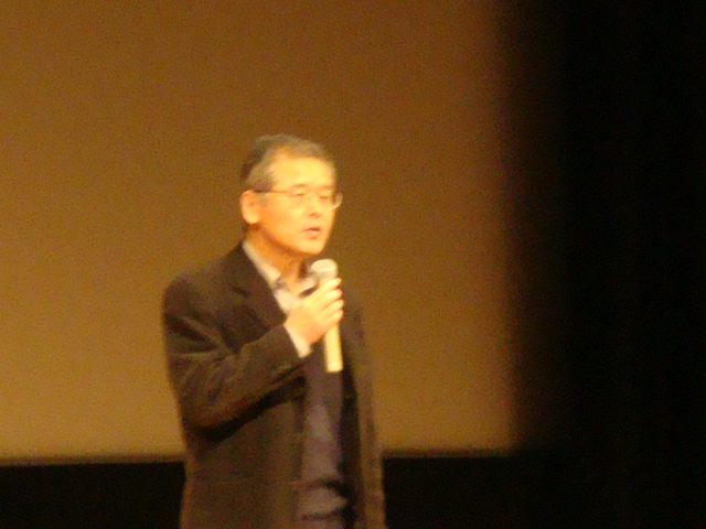いのちの山河上映会いよいよ上映会当日を迎えました。チケットを買ってもらった人たちが、どれほど来場してくれるか。見終わってからの感想はどうか。会場前に立って、続々と詰め掛ける人波に知人の顔を探すのも、一つの楽しみ方かもしれない。2回上映なので、2:30と6:30の両方に立ってみた。妻いわく、保育所や学童保育所の同窓会のようだったと。確かに、懐かしい顔も含めて、たくさんの人に会うことができた。長男の保育所時代の同級生のお父さんとか、学童保育の指導員を始めたころ小学生だった娘だとか。「ひょっとしてあやちゃん?」と、すっかり娘さんになった彼女に声をかけると「先生!覚えててくれたん?」と、幼いころのアクセントで応えてくれたり。実行委員会の挨拶が始まる直前までロビーでのおしゃべり。 バターか大砲かと訴える松久さん。自席からの望遠ショットなので、ピントが合いずらい。ごめんなさい。貧しいがゆえに医療が受けられず、どんどん人が死んでいく。近くに医者がおらず、死して初めて死亡証明書をもらうために医者に連れていく。豪雪に半年近くも陸の孤島となってしまう村で行脚と対話をモットーにナメコの生産量をあげ、ブルドーザーで道を開きバスを通す。何よりも「いのちの格差は許せない」と、国に先駆けて老人医療費から無料化してついには乳幼児の死亡率ゼロを全国でも初めて達成する村に変えていく壮大なロマンに文字通り命をかけた人たちの生きざまに感動し、また、親子の絆についても考えさせられて何度も涙を流してしまった。年とともに涙腺が緩んできているとはいえ、指でぬぐい切れずにハンカチまで使ったのは初めての経験だ。憲法25条の生存権を考える上でも、とてもいい映画に巡り合えてうれしい。知人にお勧めしてよかったと心からそう思う。2回目の上映が終わった後で、妻と久しぶりに外食をした。映画好きの妻にも、見ごたえのある映画だったそうだ。今後も府下各地で上映会の取り組みがあるそうなので、皆さんにも、ぜひ見てほしい映画です。