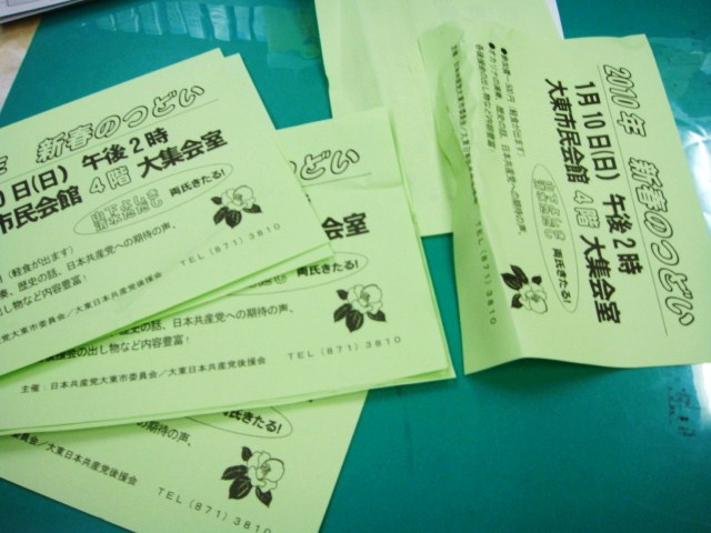 党大会2日目今までの党大会では記憶にないのですが、今回の党大会では、現地へ行っている代議員の方からリアルタイムで原稿が送られてくるらしく、北河内南地区委員会発行の「おはようニュース」に、休憩時間などを使って、情報が寄せられている。端末機のモバイル化が高度に進んできていることを実感する。もちろん、しんぶん赤旗にも、毎日関連記事は掲載されているのだが、ややローカルな内容に、目を細めてしまうことも。インターネットでも同時配信されているらしいが、午前中は後援会ニュースを担当地域に配りながら訪問をした。ほとんど留守でしたが、ポスティングはすべて終了することができました。午後からは早めにしんぶん赤旗日曜版を取りに行ったら搬入と、大まかな仕分けが終わったところでした。京橋共同法律事務所友の会30周年記念行事の案内チラシを編集してからプリントアウトして、打ち合わせ会場まで運んで、印刷をしてもらいました。早ければ明日のしんぶん赤旗に折り込んでもらえそうです。刷り上がったチラシを取りに行き、市内の各団体を訪問する段取りも決まり私は18日が当番になりました。たくさんの人に来てもらい、去年門真市で行った国保調査の報告などを聞いてもらいたいと思います。夕食を外で済ませてから夜の会議に出かけましたが、今日は二人しか来ておらず、入院したり、別の入院患者さんの付き添いに、とキャンセルが相次いだそうですが、寒い日が続くので健康には気をつけて、春を迎えたいですね。