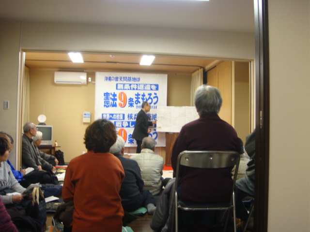 野崎駅周辺9条の会憲法9条と戦争のない世の中を考える9条の会主催の学習会があり、参加してきました。 できたての「野崎さんじょう館」をお借りしての初めての学習会ではないかな? 講師には「非核の政府を求める大阪の会」常任世話人の長尾さん。後ろに見えているのは、新しくなった駅前宣伝用の横断幕。平和と憲法について真剣に考える人たちが集いました。 部屋のふすまを開け広げているので、土間にはストーブも。エアコンだけでは暖かくなりませんから。学習会では、中国や北朝鮮から攻められたらどうする!日本も軍事力を増強するべしと言ったマスコミの旗振りに対し侵略を受ける心配のないことが、経済や歴史、世界の動向国連の働きなど、様々な角度から資料をもとに学びました。中国の軍事費は、報道される通り、日本の2倍あるけれど、その殆どが人件費に消えて、さらに、国土は日本の25倍、人口は10倍あり、単純に比較できないこと。また、中国は陸地で国境を接する16の国と、海で接する4カ国と領土問題でもめており、尖閣諸島に固執できない状況もあること。北朝鮮も戦争を仕掛けてきたとしても4日も持たないほどの軍事力しかないことや、何よりも国民が飢えていては士気が上がらないことなども指摘されました。何より、世界と国連は、軍縮と平和外交の方向へすすんでおり、世界の憲兵と言っていたアメリカとの軍事同盟は、2010年に改定されたとはいえ現在機能していないアンザス条約(米・豪・ニュージーランド)を含めても4つしな残っていないこと。米・韓防衛援助条約は最近兵力と基地とも縮小され、NATO(北大西洋条約=米・英・カナダなど28国)では、イラク戦争で、米と対立するなど、1枚岩ではないこと。唯一日本だけが固執し、「思いやり予算」まで献上してへりくだっていることなど、流れは大きく変わってきています。しんぶん赤旗の報道でも内戦などの争いはあるものの、侵略的な戦争は大幅に減っているのが21世紀の入り口です。60年安保の頃には52カ国、20億人以上(67%)あった軍事同盟下の人口が67億人中16%にまで減っているそうです。国際紛争を解決する手段としては武力による威嚇や武力の行使を禁じた憲法の精神が光っています。人類は話し合いで、平和的に協議できるようになってきているそんな気がします。学習会後に地域のTさんと、何件か訪問しながらしんぶん赤旗の購読を訴えました。連続して購読の約束を頂き、最高の気分のままもうじき90歳になる方のお家へ。お耳が遠くなっていて、電話では会話ができないので、ファックス機能がある電話機を購入して、市の補助を受ける方向をすすめ、必要な委任状に判をもらいました。帰り道、すっかり暗く、寒くなってきましたが、今夜は通夜があるので、寒さ対策として使い捨てカイロを、今シーズン初めて使いました。貼らないタイプなので、ポケットに入れて指先だけでも冷えないようにして…。