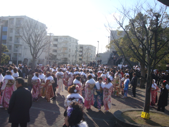 成人式がありました。式典は10時からですが、早めに到着するように出かけました。毎年、新日本婦人の会大東支部の方たちが核兵器廃絶・平和署名行動を行っているからです。それに、かつての教え子たちに会えるかもしれないので。 でも、この中から探すのは殆どムリ!ですよね。署名ボードの近くで「二十歳の記念に平和署名を!」「核兵器も戦争もない世界を!」と、新婦人の方と一緒に呼び掛けるとノリのいいグループや親子連れなどが応えてくれました。5分前に会場に入ると、控室に案内され、他の来賓といっしょに舞台裏から客席へ誘導されました。既に座席の背もたれには、氏名札が貼り付けられています。こんなVIP待遇しなくてもいいのに、主役は新成人たちだからね。その新成人たちの実行委員会メンバーが司会に立ちその横に手話通訳者が式典をすすめていきました。 1300名をこえる新成人たちに手紙を出し、20年間の「ありがとう」を言葉にしよう!と訴えたそうです。会場受け付けにも投函ボックスを設置してあるので帰るときに投函してくださいとも。今後も活動を続けて、寄せられた「ありがとう」を編集して、冊子にでもするのかな?楽しみです。 近大付属高校・ESSCのゴスペル、地元地車保存会青年部の太鼓演奏などもありました。最後は舞台と会場が一緒になって♪ きみをわすれない~と、スピッツの「チェリー」を大合唱して閉幕しましたが、終わってみて、「あれ?」去年までは小中学校時代の様子や時には先生たちの登場するDVDなどが投影されていたのですが今年はありませんでした。参加している新成人たちは、殆どが学校時代のグループで着席しているので、○○中学校の修学旅行などが紹介されると会場のあちこちで歓声が上がって、それなりの盛り上がりがあったのですが、今回はどうして省いたのかな?きっと、実行委員化の中でもいろんな意見が出たのでしょうね。でも、それはそれ、私たちが注文をつけるべき問題ではありませんよね。あくまでも主役たちの決めることですから。