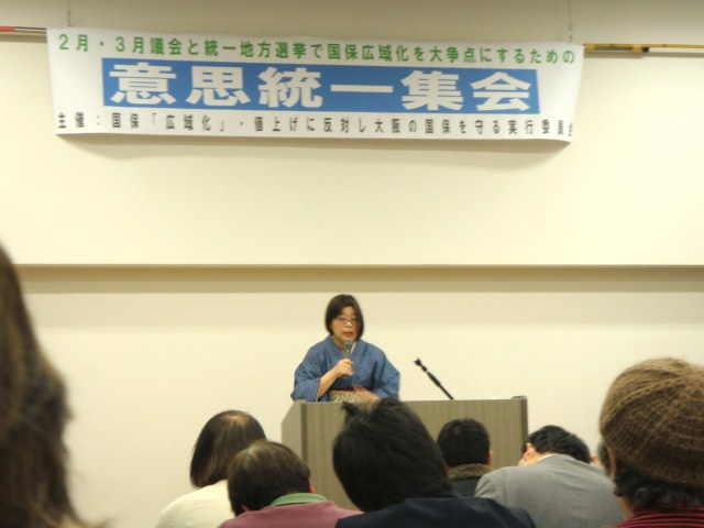 意思統一集会参加大阪府知事が、国に先駆けて行おうとしている国保の広域化ですが、只でさえ高くて払えない国保料(税)が値上げされてはたまりません。その狙いと、仕組みを知るためにも、と、保険医療協議会のMDホールへ出かけました。とはいえ、ナンバ周辺の繁華街はどうしても苦手で、山の中では迷わない自信があるけれど、JR難波駅を降りてすぐに迷ってしまいました。地上に出ても、目当てとする星や月が見つからず、以前にも来たことがあるところなので、見覚えのある建物などを目安に何とかたどり着くことができましたが、かなりのエネルギーを使いました。(それでも痩せませんが・・・。) 寺内さんの分かりやすいお話、大阪市議会議員の実践的なお話資料を手にして聞いているときには「なるほど」「これは使える」などと思うのですが、議会報告版に記載しようとすると慌てて資料を紐解くしまつです。特に数字が絡むと「もうあかん」と投げ出したくさえなります。頑張らなくては!帰り道は、JR難波駅への案内板などを頼りに駅近くまで。すると、あろうことか、若いお兄さんたち6人くらいが私に、私にですよ、道を尋ねてくるではありませんか。地図を持ってはるけれど、案の定全然分かりませんでした。ごめん! 相手を見てから聞いてね。ふと見上げると FMおおさかのタワーが見えていました。次男たちのバンド「アマノジャク」全盛の頃はここで収録をしたり、生でオンエアーされたりしていたんだなぁと、今更ながらボーカリストをひき逃げした犯人が許せなくなります。 駅ビルの地下では、鏡や球体に姿を映しながら若者たちがブレイクダンスやヒップホップダンスの練習。暫く見とれてしまいました。煙草の吸殻やゴミなども、捨てずに、きれいに使っています。さあ、電車に乗ろう!と思ってホームを探したのですが、またまたグルグル迷ってしまいました。さっき降りた駅なのですがね…。ようやくホームに着いたら、「奈良行き」のボックス席がある電車。JR難波駅は終点だから、これに乗らなくてはならないと思うのだが、奈良には行きたくない。今宮か天王寺駅で環状線に乗り換えて京橋駅を目指したい。でも、電車はこれしかない、ということで思い切って乗り込んでから、車内の駅名表を見ると、天王寺を通ることが分かり、一安心。ホームにも書いてあったかもしれないけれど、見渡した限りでは分かりませんでした。せめて駅員さんがいれば、助かるのになぁ…。