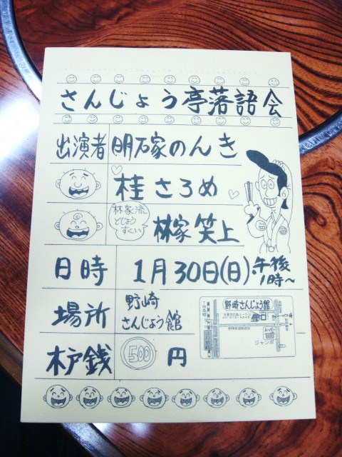 被災16年阪神淡路大震災から16年復興公営住宅で暮らす人のレポートが報道されているが高齢化が進み、ますます自立困難とのこと。孤独死も依然無くならない。それでも間もなく「借り上げ期限」の20年になるからと神戸市や兵庫県は入居者に転居を迫っているという。今の住居に住み続けたい(86%)これは日本共産党神戸市議団と県議団が昨年末に緊急に取り組んだアンケートへの回答。転居は経済的と体力的に難しい。一体どうしたら…。と、切実な声が寄せられているそうだ。日本共産党は、入居者の願いを受けて、非人道的な転居の押し付けを許さず、借り上げ延期などで住み続けられるよう各議会で要求。その中で宝塚市は住み続けられるようにすると発表し、県知事は買い取りを検討すると発言しました。しかし、借り上げ住宅を含め震災後に自治体が供給した、四万人が住む復興公営住宅全体では、もともと入居者の孤立や貧困が深刻なうえ高齢化が進み、現在の高齢化率(全入居者に占める65歳以上の割合)は48,2%にのぼるとか。一般県営住宅の高齢化率24.8%の約2倍です。昨年の孤独死が51人。トータル681人とのことです。行政として手を打つべきことがあるのでは中と思います。政府もアメリカには「思いやり予算」として毎年三千億円前後の税金を軍事費以外にもあげていますが、国民、特に被災して本当に困っている人たちに手を差し伸べてほしいものです。さて、「野崎さんじょう館」の運営委員会があり、参加したのですが、早速写真のようなチラシを頂きました。落語会のお知らせです。手作りの、楽しそうな雰囲気が伝わるチラシ。 チラシの右下の地図も工夫されて分かりやすくなっていました。沢山の人に楽しんでもらいたいですね。次の会議があるので移動しましたが、今日も、あまりの寒さにグランドコートを着込んでスーパーカブに乗り込みました。野崎さんじょう館は、私のマンションから歩いていける距離ですが、次の会議までは、原チャで風を切らなくてはならないのでこたえます。