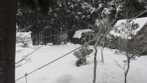 ホワイトクリスマス 朝7時、改めて小屋の外を見ると、そこは銀世界だった。 娘たちを迎えに行く時に、改めて小屋を振り返る。 右のやや大きめの小屋はゲストハウスだが、まだ作りかけで妻壁に隙間が残っている。 左奥に屋根が見えているが、「屋根小屋」と呼んでいて、本当に屋根だけで、BBQコンロやテント・マット・椅子などが置かれている。眠ることができるのは右奥の小さな小屋だけだが、朝起きた時も部屋の中で吐く息が白かった。 かように寒いところから抜け出すように娘たちが待つ、安曇川荘へ向かう。 幹線道路などはすべて除雪されているので安心して運転ができる。標識の道の駅「新本陣」の朝市へ立ち寄り、ホルモンうどんを注文すると、お店の人がすっかり覚えてくれていて、辛味の調節をしてくれる。 辛いもの好きな妻には青唐辛子を追加、私は「おこちゃま」なので、追加なしでも十分に辛い。よくあんなものを入れるなぁとぞ思う。 娘も辛い物を食べるとじんましんのような表情が出るので、ホルモンうどん以外のものを注文するようにアドバイス。 天然酵母パンを仕入れてから、もう一つの「朝市」へ。 農土花のすぐ脇を流れる清流、麻生川の上流に住むAさんご夫妻の骨董店、すぐ下流のTさんご夫婦によるイノシシ汁「十六汁」とは、シシにかけた駄洒落だが、ファンが多く、惜しまれながらの引退だった。他にも朽木のさっちゃんが作る「サバずし」「ニンニク卵黄」「大名煮」「山菜おこわ」などなどを目当てに、京都・大阪・滋賀の人たちが集い、釣り人が釣り上げた獲物や、猟友会の仕留めたシカやシシなどの地元にとっての害獣の肉が献上され、豪快なたき火によって調理され、来る人たちに振舞われる。 地元の野菜なども店先に並び、早々に売り切れてしまう。どのお店も利益などは度外視しているので、とにかく安いと好評だった。 小さな田舎町の社交場のように、次々に人が訪れ、客同士がここで仲良くなてしまい、お互いを名前やあだ名で呼び合うところでもある。 十数年前に「共同学童保育所・指導員」をしていた私は、「先生」と呼ばれていたが、市会議員になった今も同じように呼ばれている。 今日の市を最後に、店を閉めてしまうので、次々に各地からのお客さんたちが差し入れを持ってやって来る。私たち親子もそうしたメンバーの一員。 雪が降りしきる中で振舞われたものは、長年お世話になった娘夫婦の差し入れたケーキ(クリスマスだからこれにしたと娘)をはじめとして、シカ肉・おでん・みそ汁・ホットコーヒー・ゆずジャム・カブの漬物・各種お菓子類などなど、食べきれないほど沢山の善意が集まっていた。 黙々と炭火でシカ肉を焼いているのは「オムロンさん」、90年代に小学館の月刊誌ビーパルに投稿した私の記事を読んで声をかけてくれた人だ。 麻生川の上流にある公民館前に車を停めて寝泊りをしながらアマゴ釣りをしたり、山菜や木の実、キノコなどを採取したり、地元では子どもたちを対象としてアウトドアスクールを開いたり、木地山にハイキング道路を整備したりと、自然大好き人間だが、このたびの東日本大震災の被災地にも長期にわたり6回ものボランティア活動をしているそうだ。 先日、ボランティアに行ってきた妻と同じ被災地にも行っており、話が弾んでいた。 大阪では忙しくしていた私も、今日だけは無理を言って休ませてもらって良かったと、心のタガを外して大いに歓談を楽しんだ。 今日を限りに、この朝市が無くなってしまうのがとても残念であり、本来ならば私も手作りおもちゃなどで出店して、一緒にやっているはずだったのだが、来年の4月には2期目に挑戦することにしたので、叶わぬ夢となりつつある。 ホワイトクリスマス。 ちょっぴり切なく、心温まる雪国での一こま。 近くの桐の実、役割を終えて雪をかぶっているが、死んだわけではない。 同じ木の梢の頂には次の花芽がスックと立ち上がっていた。 大阪に戻り、娘夫婦を家まで送り届けた時にドレスアップされた自分の車に気がついた。 ご近所の山茶花が写り込んで、まるで車に花が咲いたかのようで、ついつい嬉しくなってパチリ!娘たちはあきれ顔? まっ、気にしない!