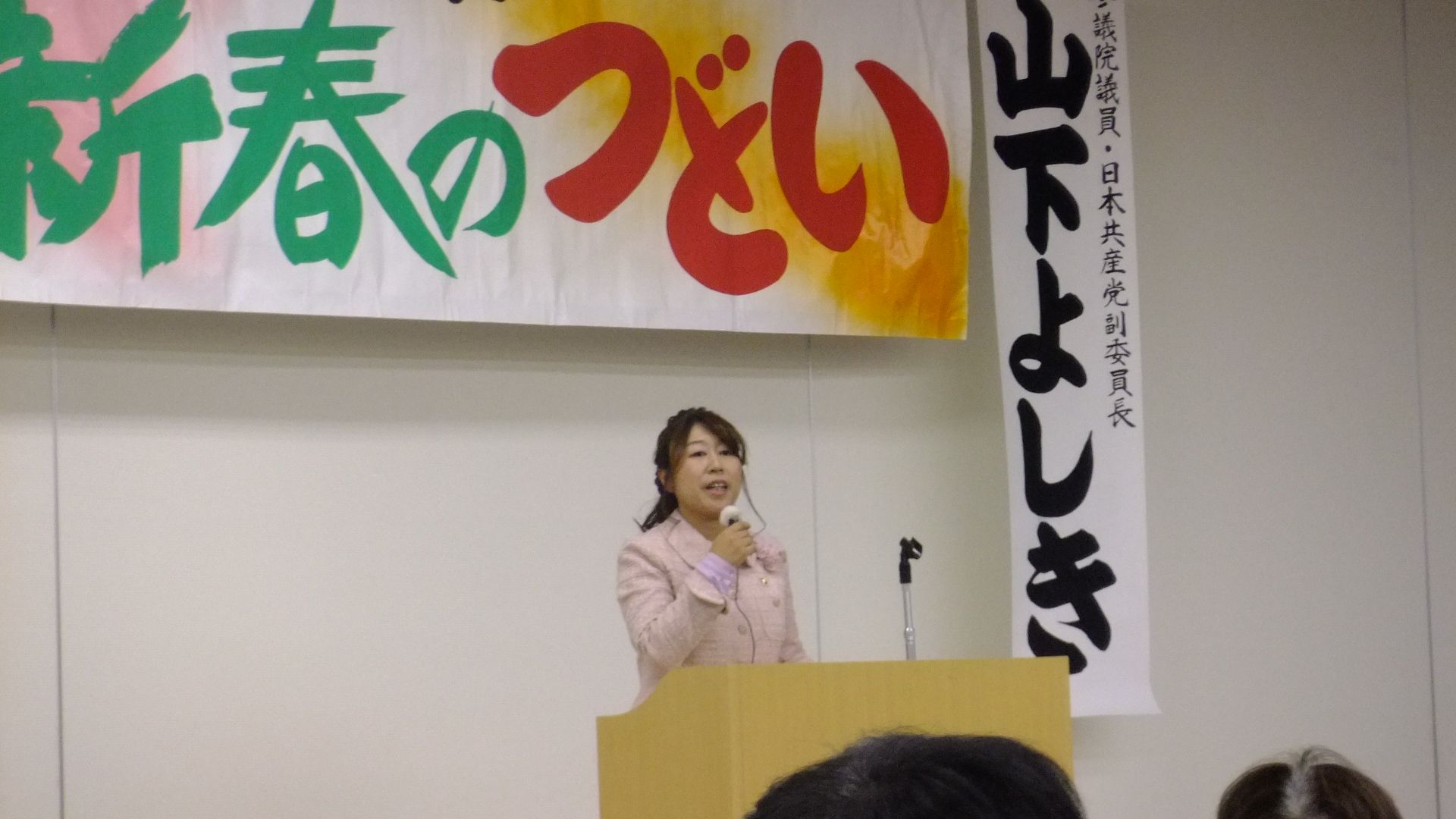 日本共産党・大東市委員会・後援会の新春の集い 新春の集いは午後から開催。もちろん健全会計で会費は¥500です。他の政治家が資金集めを目的に行う「パーティー」と違って、ワンコインでどなたでも参加しやすいようにとの配慮から、酒類は一切無し。あらさき市委員長(市議)の挨拶や天野市議の挨拶と報告、大東市在住、唯一の国会議員 山下よしき党中央副委員長による国会情勢など、分かりやすく報告がありました。 歓談タイムには、各テーブルを回り 記念撮影も。でも、会場が沸いたのはもう一つありました。 演舞やクラリネット演奏などに続いて白波5人衆が舞台上で寸劇。真面目!印象の強い天野市議が振り返った瞬間です。みえを切る仕草にも拍手喝采でした。もちろん、政治的メッセージもしっかり訴えていました。