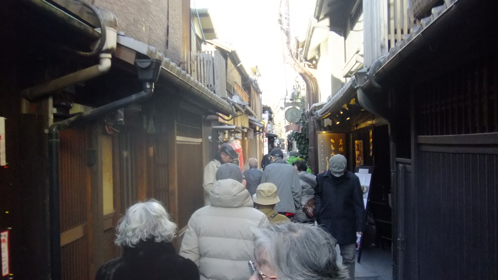 前進座の新春公演へ 日本共産党の後援会行事で、毎年恒例の「前進座」公演を観にいきました。JRと京阪との乗り継ぎのために京橋駅前広場を通ると、自衛官募集のティッシュ配りをしていました。自衛のため、被災者救助活動のため、資格取得、などなど、入隊動機は色々あるのでしょうが、貧困格差政策のあおりで他の選択肢が無い人もいることでしょう。 いずれにせよ、今国会で憲法改悪の動きを見せる安倍自公政権と維新・希望などの補完勢力がもくろむ改憲=9条の無力化がまかり通れば、真っ先に犠牲になる自衛隊員。その家族も心配でたまらないことでしょう。 絶対に許すことはできません。 おととしまでは祇園四条の南座で公演をしていましたが、去年からの改修工事のために、引き続き今年も祇園三条の先斗町歌舞練場へと電車を乗り継ぎながら、みんなでゾロゾロ・・・。 趣のある細い路地が続きます。 舞妓はんともすれ違ったりして、おぉ~!っと声が上がります。 少し早めに到着したので、鴨川沿いで記念撮影。 あらさき市議がシャッターを押してくれました。加茂川だけに カモ?いやいや、色々といましたよ。 前進座公演は、写真撮影が禁止されていますが、棒しばりという狂言もあり、唐茄子屋という人情話もあり、見ごたえがありました。開演前の清水ただしさん・たつみコータローさん・宮本たけしさんの挨拶トークにも大きな拍手が贈られました。京橋に戻ってから、妻と夕食。 久しぶりに食べたくなったので、印産屋でステーキカレーを注文。 やっぱり美味しい!