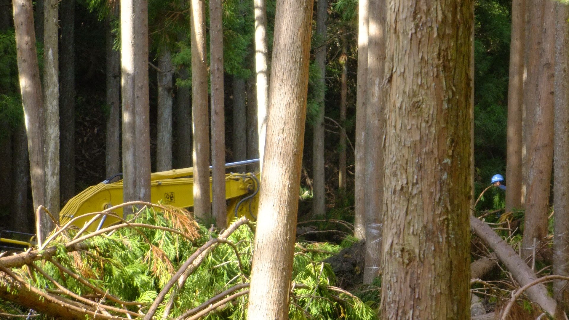 一級河川・麻生川農土花に隣接して流れる川に台風21号により倒木が・・・。自然ダムが形成されてしまうと決壊時にいわゆる鉄砲水が発生する恐れ。この川は一級河川・麻生川。ようやく本日からこの地域の倒木の撤去作業が始まりました。3人くらいの作業員と、何と!大型重機が川に入っています。私のところは鋸で枝を払い直径20センチまではその鋸で玉切りしますが、重機は太い幹をはさみ枝打ちも玉切りも、楽々こなしていきます。10時のお茶をしている時に突然!ヘビがすっ飛んできてカエルを飲み込みました。ヤマカガシだと思います。黄色い襟巻きが見当たりませんが地域差や個体差が多いので鱗のキールなど、詳しく見ないと分かりません。飲み込まれたのは、さっきまで鳴いていたモリアオガエルでしょうか。ヒキガエルも襲われますが、その皮膚にある毒も自分の毒にしてしまうそうです。こんなことをしている間に河川にかかった杉の倒木はすべて撤去されていました。支流との合流点にあった三つ編み杉も新たに発生した倒木もすべて綺麗に片付けられています。私のほうはまだまだ・・・払った枝の長さを決めて玉切り。なんごうこどもまつりでの丸太切り競争に必要な材料です。夕方近くに妻が大阪から・・・「今日は貧乏すき焼きをしよう」と材料を仕入れてきてくれました。ならば!と、カセットコンロを用意。でも、中々火がつきません。ガスは残っているはずなのに・・・?確認すると、例の蜂の巣がここにも!びっくりです。明かりをつけて、久しぶりの豪華な夕食を戴きました。妻に感謝です。