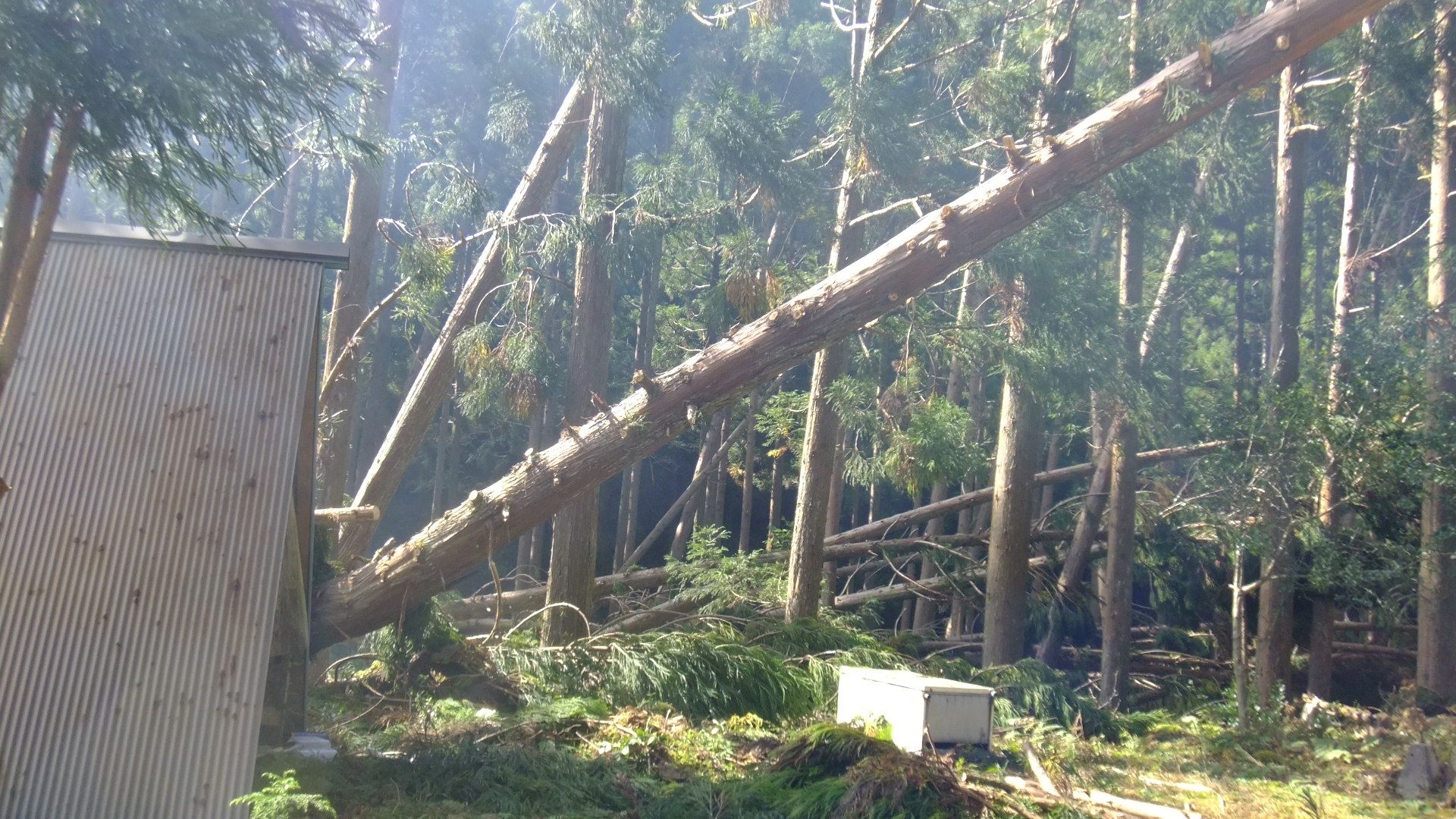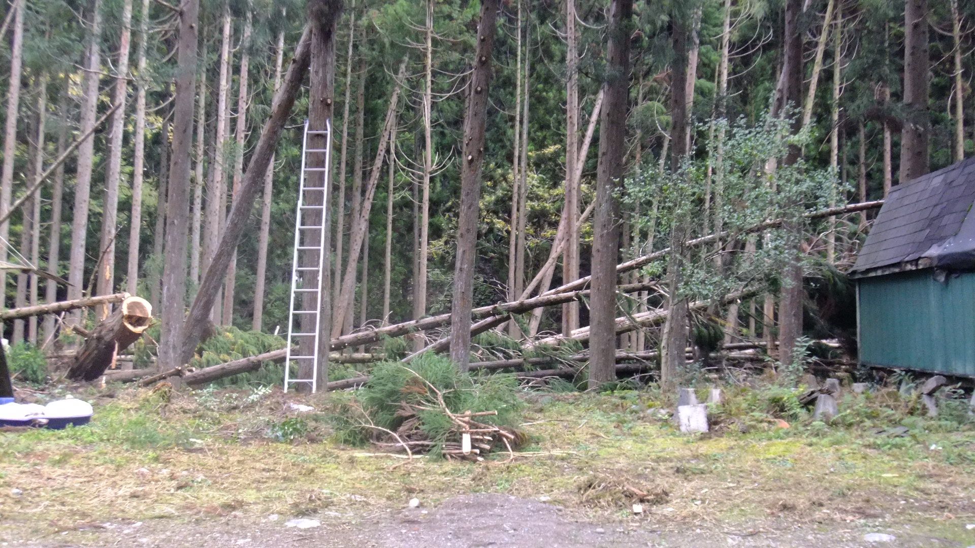 強風が続くゲストハウスで一晩過ごしたが、カメムシの襲来がすごかった。暖房器具を使用すると室温があがるにつれて活動が活発化する。蛍光灯をつけると、明かりをめがけて体当たりを続けて、挙句の果てにポトン!頭と言わず、背中と言わず、落ちてくる。殆ど熟睡できずに、朝を迎えた。強風と小雨交じりの天気に戸惑うが、できる作業はしておこうと2連はしごをかけた。杉の枝を積んである部分に小屋を置くので、この部分の枝打ちが最優先される。ギリギリまで伸ばしても届かない枝もある。ぶり縄という、棒とロープを使った登り方も知ってはいるのだが、風が強いので危険と判断。はしごの上から見るとこんな感じ。結構怖いし、杉の幹がしなるくらいの風が私の体ごとはしごを揺さぶる。そのはしごは、台風23号で先端が曲がっている。風で折れた杉の枝も危険なもの。いつ落ちてくるか分からないので体重をかけずに、そぉーっと落とす。カメムシの侵入対策もしてみた。ゲストハウスの隙間を埋めるだけだが2~3ミリ程度の隙間からでも侵入してくるので完全にはできないものの、少しでも・・・。夕方、冷え切った体を温めに天空温泉に。帰り道に見つけた路上のコーン。2本の枝が、まるでシカの角みたい。シカの食害とカメムシの侵入が目下の悩みであります。