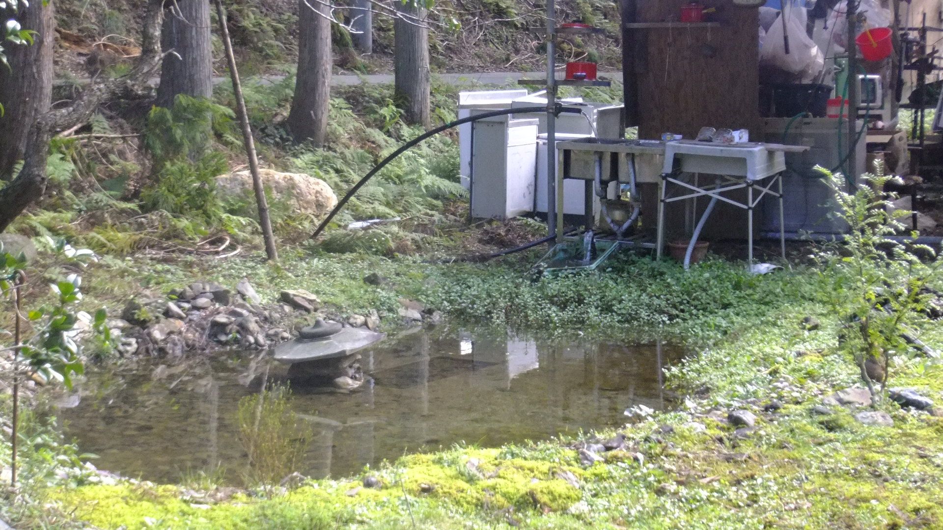 台風24号7時前の気温計が13度以下になっている。放射冷却か?少し寒い。雲ひとつない晴天。下弦の月も西の空に見えている。昨夜は気づかなかったが池の水が干上がり2×4材が吹き飛ばされススキもなぎ倒されていた。シンクタンクに水は溜まっていたが淀んでいて使えない。なので、早速沢水の確保に山を登る。支流の水は多め。雨台風だったのかも。一級河川の麻生川。倒木が流量に負けそうになっていた。谷川の水量も多い。21号で倒れた樹木の新芽が逞しく上を向いて生えてきた。案の定、流れに押し戻されてUの字に曲げられたポリパイ。水源地に向かう林道の水溜り。アカハライモリがのんびりと・・・。取水口を直し、パイプをすい続けると、ゆっくりと流れ出す。濁りはあるものの、段々と勢いが増してくる。ここまでくれば一安心。林道の途中で見つけたケンポナシ?本来ならば甘いのだが、朽ちていたので味見せず。樹木はどこかな?もう一つの落し物はこれ、釣り人が仕掛けを巻きつけるもの。昔は竹とヒゴで自作した記憶がある。簡単に手に入れられるようになり、有り難味も失われてしまったのか。それとも単純な落し物なのか?農土花の新しいゲートをくぐり沢水を確かめるいいね!池の水も回復しそうです。さぁて、仕事しごと!杉を燃やし倒れた金柑を剪定し棘と戦い、燃やす。合間を縫うようにゲストハウスの修理。パンク修理用の車のジャッキを持ち出して基礎と土台の間に入れてハンドルを回すも車よりも重いからか、人力では無理!悪戦苦闘していると上流に住むMさん。「大変じゃったやろぅ」とねぎらいの言葉。さらに私の敷地に倒れた杉を「好きなように使ってください」とも。時間差でK母さんも!21号被害で電話が不通だったのが昨日まで一月間続いたこと、河川に倒れこんだ杉は業者委託がされたことなどなど、貴重な情報を戴いた。えっ?電話が通じた?と言うことは下のTさん宅と上のKさん宅との中間にある我が家の電話ももしかして・・・試してみると「ツーッ」という発信音が聞こえてきた。携帯電話が私のところだけ圏外なので、不安があったが、これで一安心ですね。