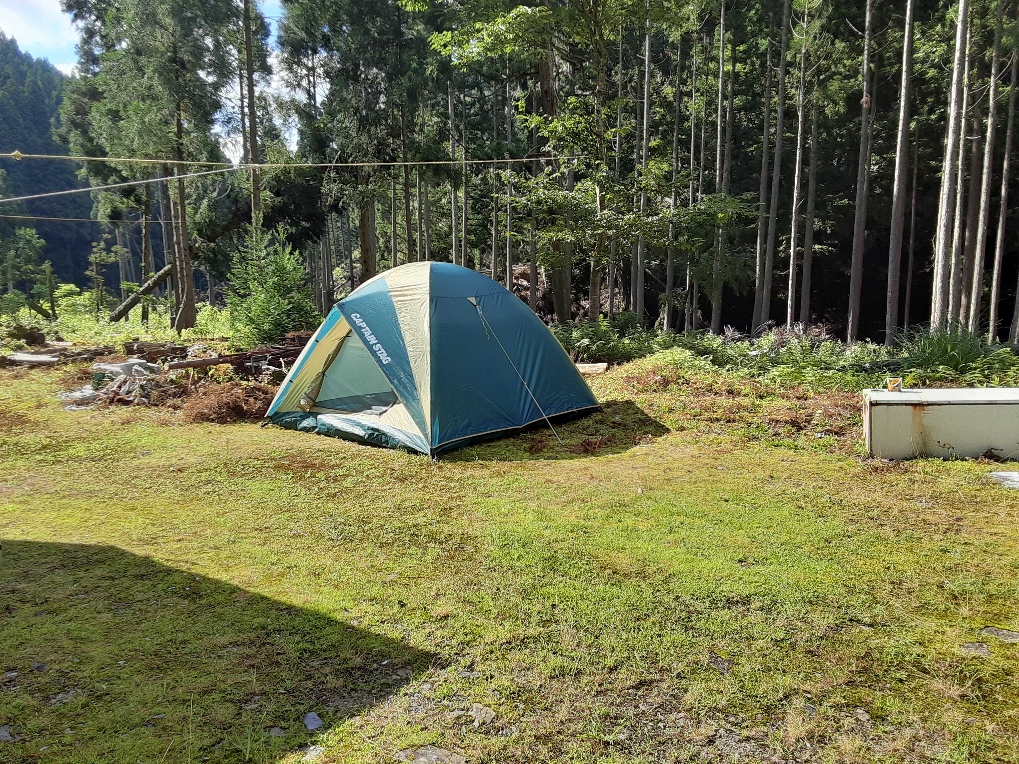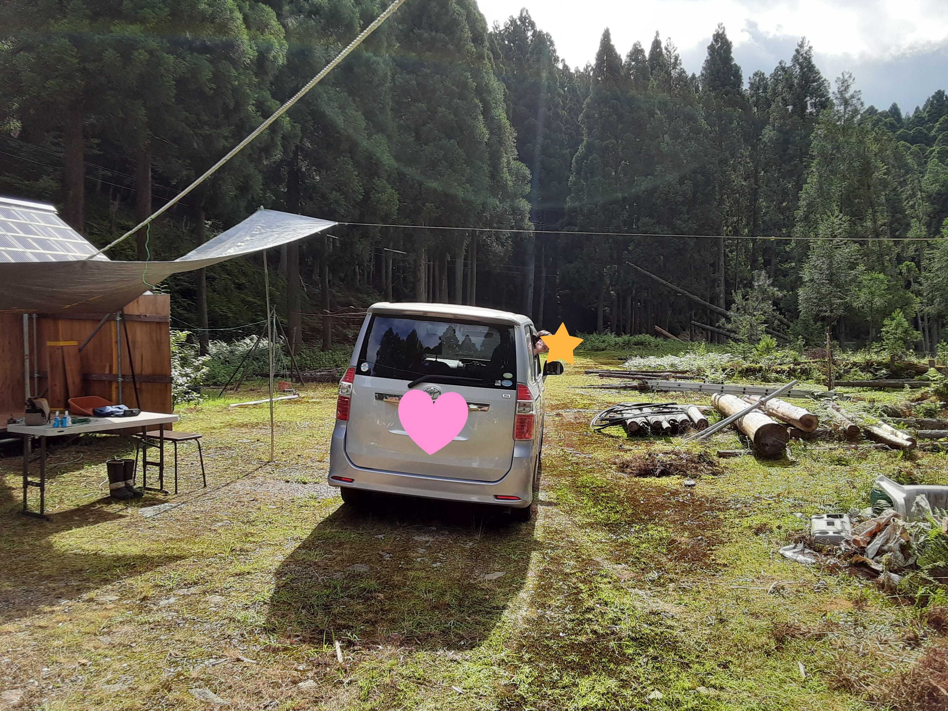 しばしのお別れ・お見送り・・・朝食をとってすぐに妻と2号君を乗せて帰宅するワゴン車をお見送り・・・。窓から顔を出して手を振る2号君の姿が見えなくなるまで、見送りました。さっ!気を取り直して作業に入ろうという時に・・・雨が降ってきました。でもすぐに上がり、青空がのぞく天気に。明日はテントを張って泊まりに来る友人があるので、天気が気になります。作業のほうはボチボチと・・・。テントサイトの草刈や、タープの設営なども交えて夜を迎えました。