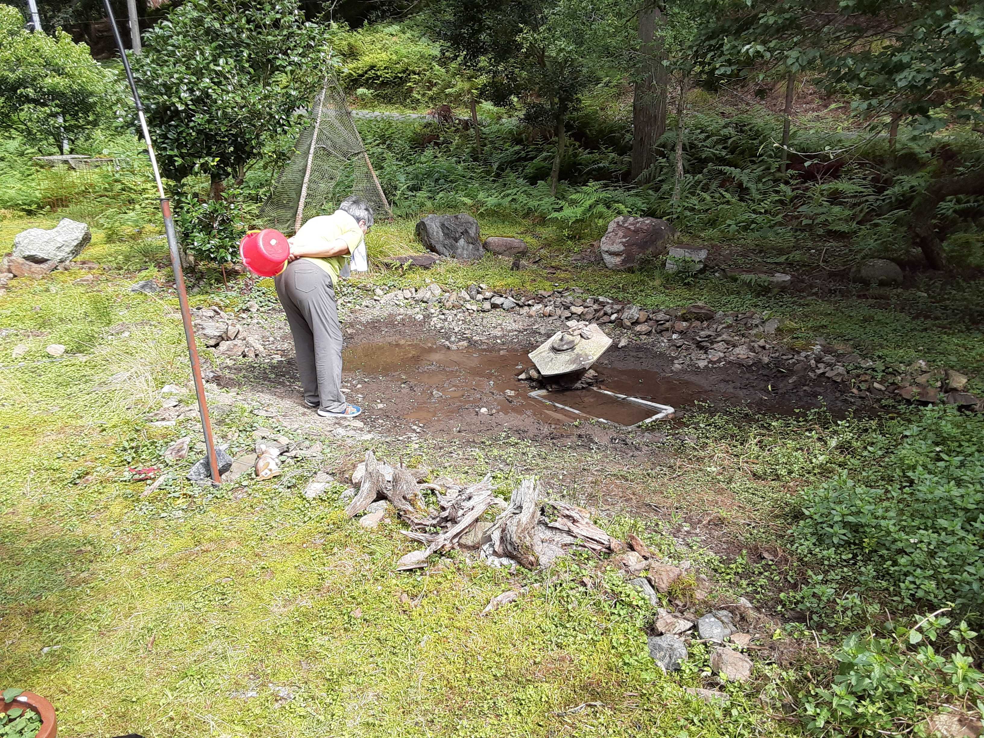 こんな所に!!!おととい、沢水の取水口をきれいにして、ポリパイから勢いよく水が出てきたので、池の水位もすぐに上がってくるものと思っていたのだけれど、・・・。一昼夜かけてもこんなもんでした。おそらくどこかに水はけの良いところがあるのでしょうね。ガラ石だらけの場所を掘って水を注いだだけの池なので、水が溜まるようになるまで20年くらいかかったし、これだけでも水が溜まってくれたことだけでも感謝すべきでしょうが、どうしても一杯になってほしいという欲が出てしまいます。さぁて、今日の作業で必要になるのでコンテナの中にしまっていたドリルを取り出すと!何と!こんな所に蜂の巣が!!!どうやらトックリバチのようですが、親蜂の姿は見当たりません。巣を壊すと、どこかで見ていた蜂が復讐に来るかも?などと、恐る恐る引越しさせました。作業の後は温泉。温泉好きの妻と2号君のおかげで、連続の温泉通いです。露天風呂は混雑していますが、石の湯・木の湯はご覧のとおり、空いていました。さてその帰り道・・・朽木サファリの入口で、ウサギ発見。昨日はシカでしたが、よりレアなウサギのお出迎えに車内はハイテンション!しかも、いつもよりも多彩なポージング。暫く見とれてしまいましたとさ。