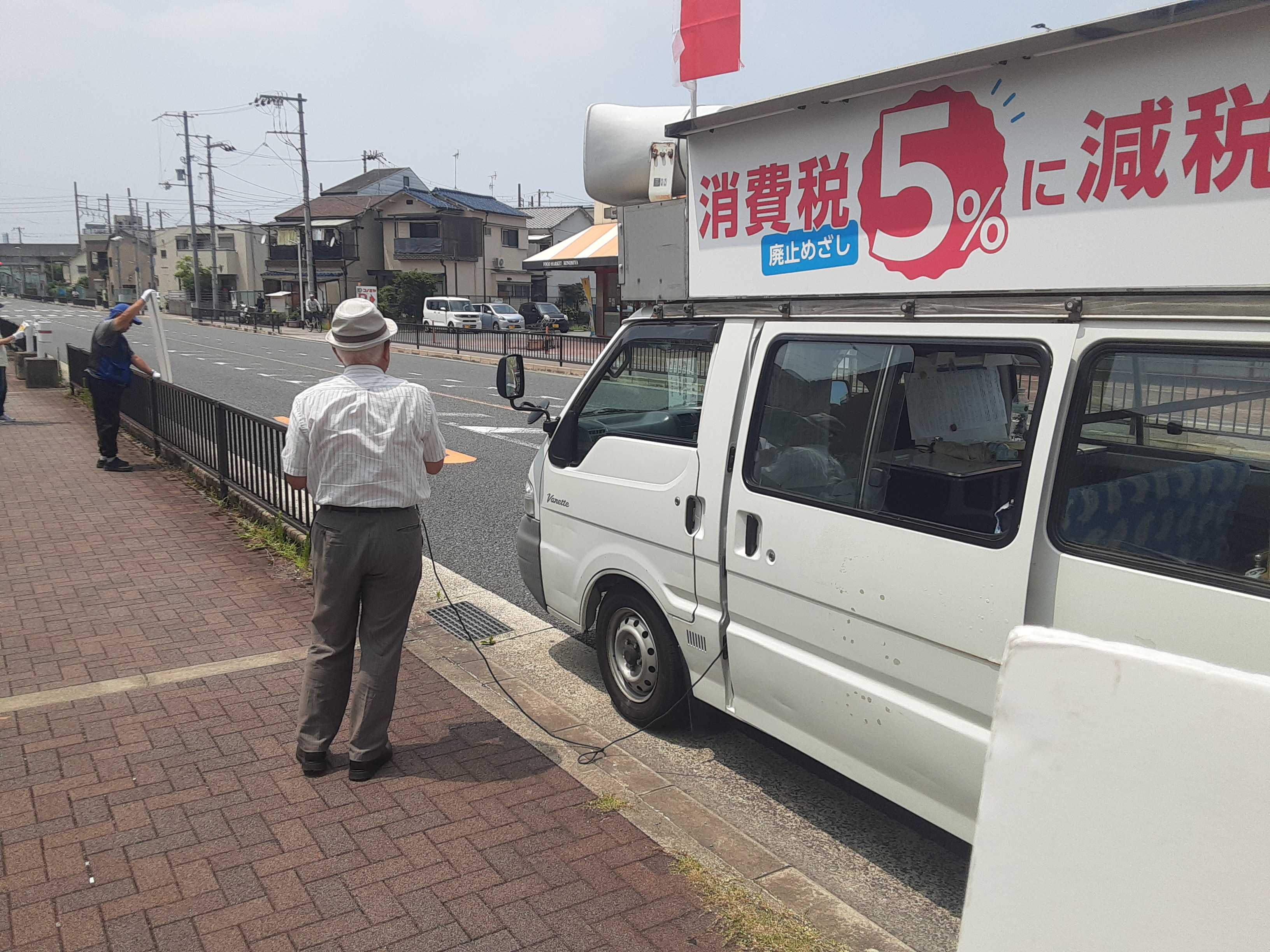 今日も街宣車に・・・暑い夏を実感しながら、今日はお昼から街宣車に載せてもらいました。駅前で待ち合わせをして、市内を回ります。スーパー前で訴えたり、住宅付近でも・・・住み慣れた町なので不安はありません。最後には・・・出発点の駅前でスポットをして解散です。車は引き続き他市へ回ってゆくそうなので忘れ物をしないように気をつけて下車。今日は会議も無いので駅前公園を散策。夏の暑さにも負けずに可憐なヒルガオが目を楽しませてくれました。