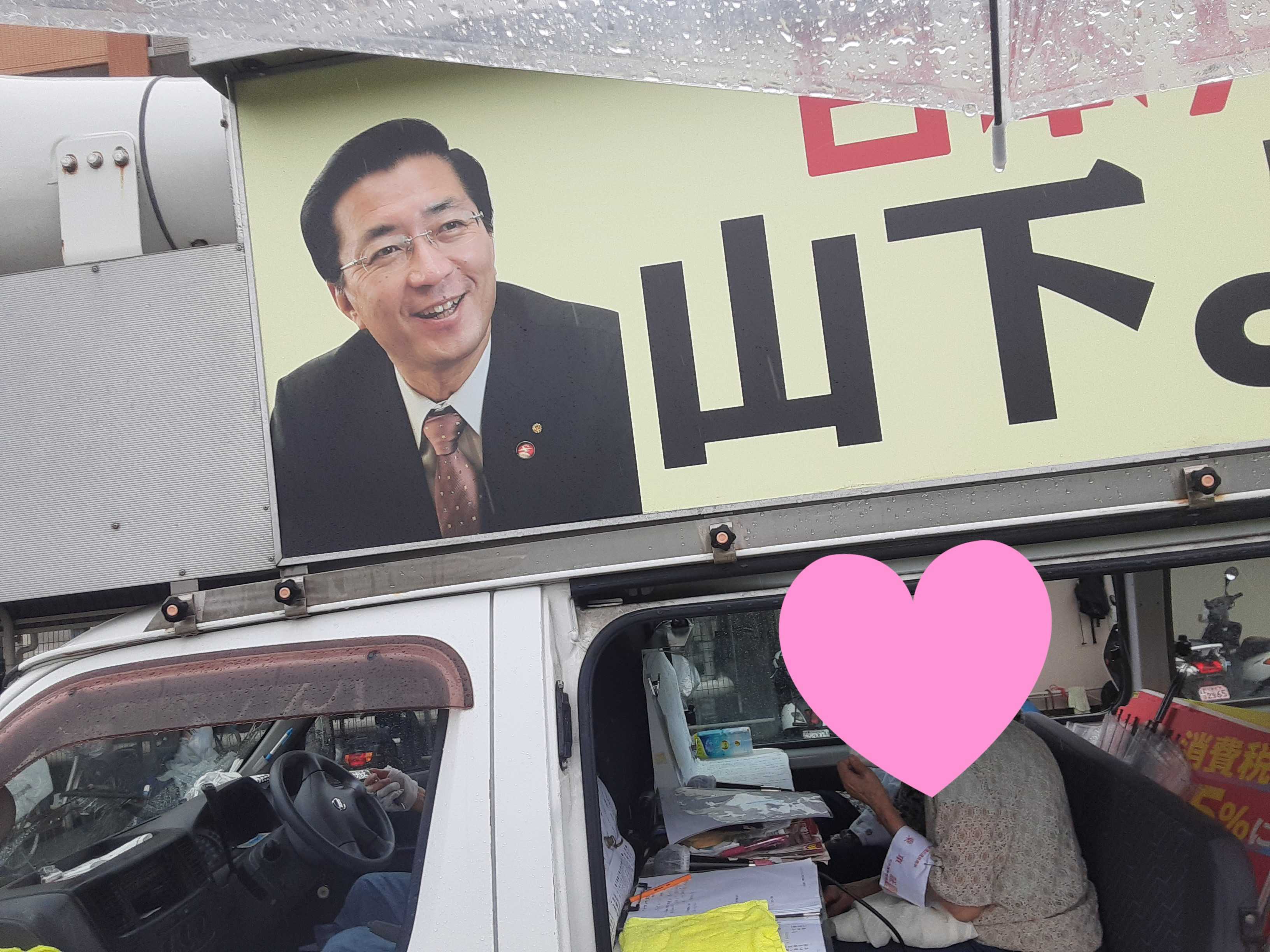 終盤戦に・・・参議院選挙も終盤を迎えているけれど、他の候補者カーとすれ違うことは稀・・・。まっ、ともあれ出来ることをやるだけ!今日は山下よしき候補者カーへ同乗させてもらいました。ベテランのアナウンサーの隣へ乗車。助手席で手を振っているのは・・・天野市議。しっかりと政策を訴えてアピール。今日の天気も雨降りですが、やはり今日も雨にも負けず!ですね。