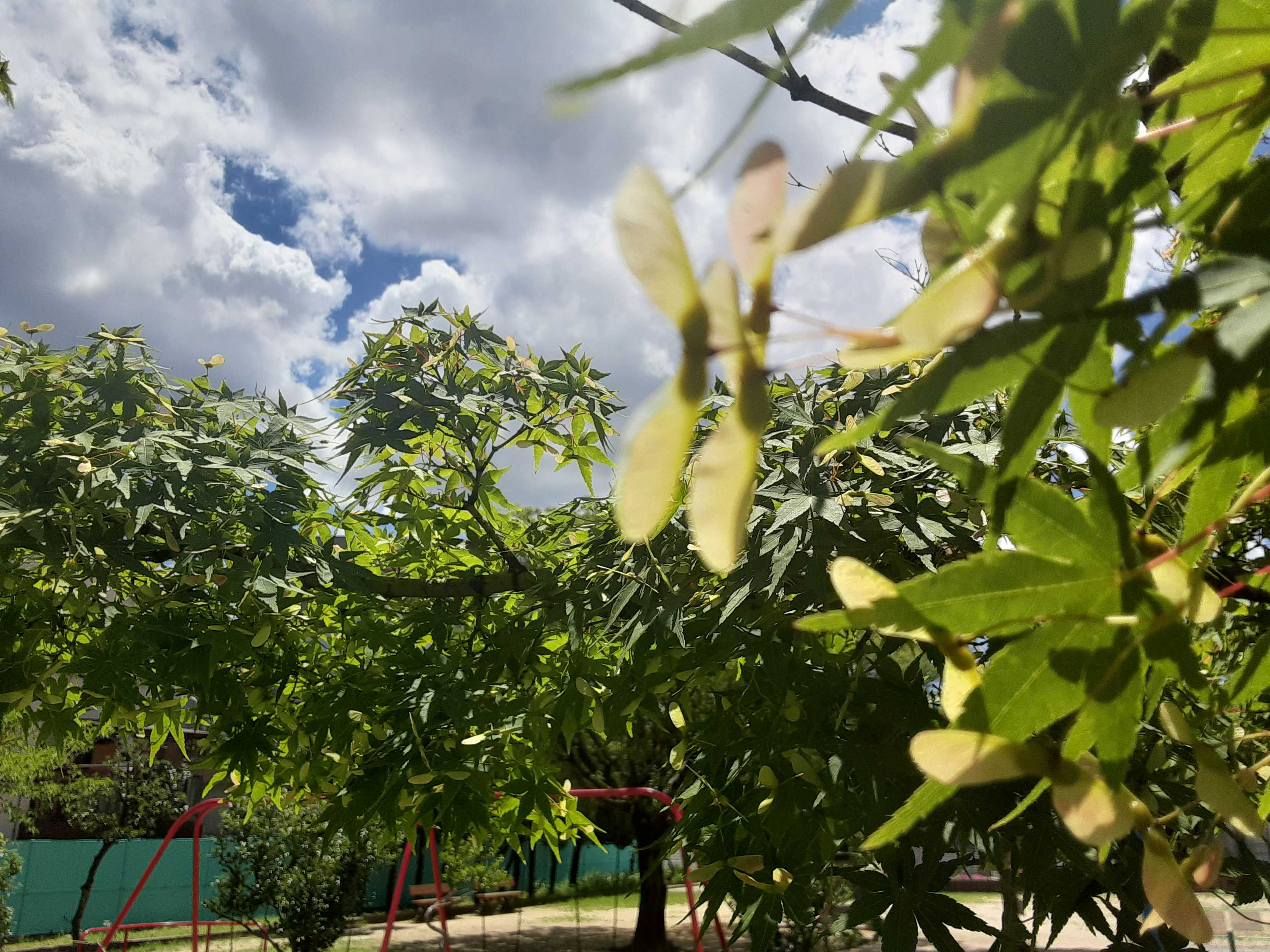 秋空かと・・・いよいよ投票日。近くの公民館へ。途中でかえでの木を見つけました。その梢にはプロペラのような種子が出来ていました。もうすぐ秋になるのかな?そういえば秋空のような天気。ブドウの棚越しに見上げる空も秋っぽい・・・投票を済ませてから一度家に戻り体を休めてから夕方過ぎに再び出かける。今度は市民会館。市内の投票箱がすべてここに運び込まれ、集計作業が始まります。集められた箱は中身を全て出してから、空っぽになったことを立会人たちに見せてまわってから片付けます。そして、積み上げられた投票用紙を仕分け・カウントして、候補者ごとに並べられます。もっともドキドキの時間帯ですね。そして、機械や人の目でも解読できなかった用紙が集められ、最後の1票まで投票者の意向に沿うように協議されます。また、点字の投票者による記載も数枚ありました。こうして最終結果が立会人たちにも配られ、スマホで撮影したのですが、残念ながらPCに落とすことが出来ませんでした。まぅ、既にご存知のようにテレビや翌日の新聞などでも結果発表が行われていますから。100%の開票が終わり、市民会館を出るときに・・・生け花に目が留まりました。キャラボクと小菊の作品でした。でも、よく見ると三位一体と書かれています。水盤に配した石も含めてみるべきでした。植物ばかりが生け花ではないようですね。深夜1時過ぎまでかかった開票作業の立会いで疲れた心を和ませてくれた作品です。