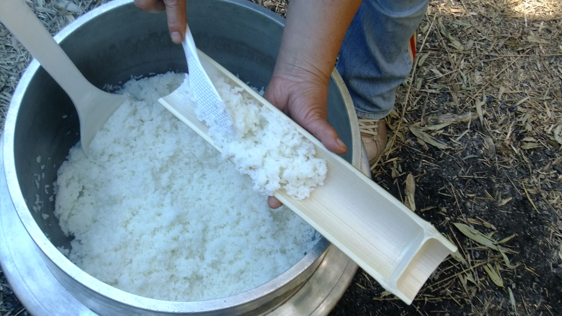 大きな葉釜で炊いたご飯に