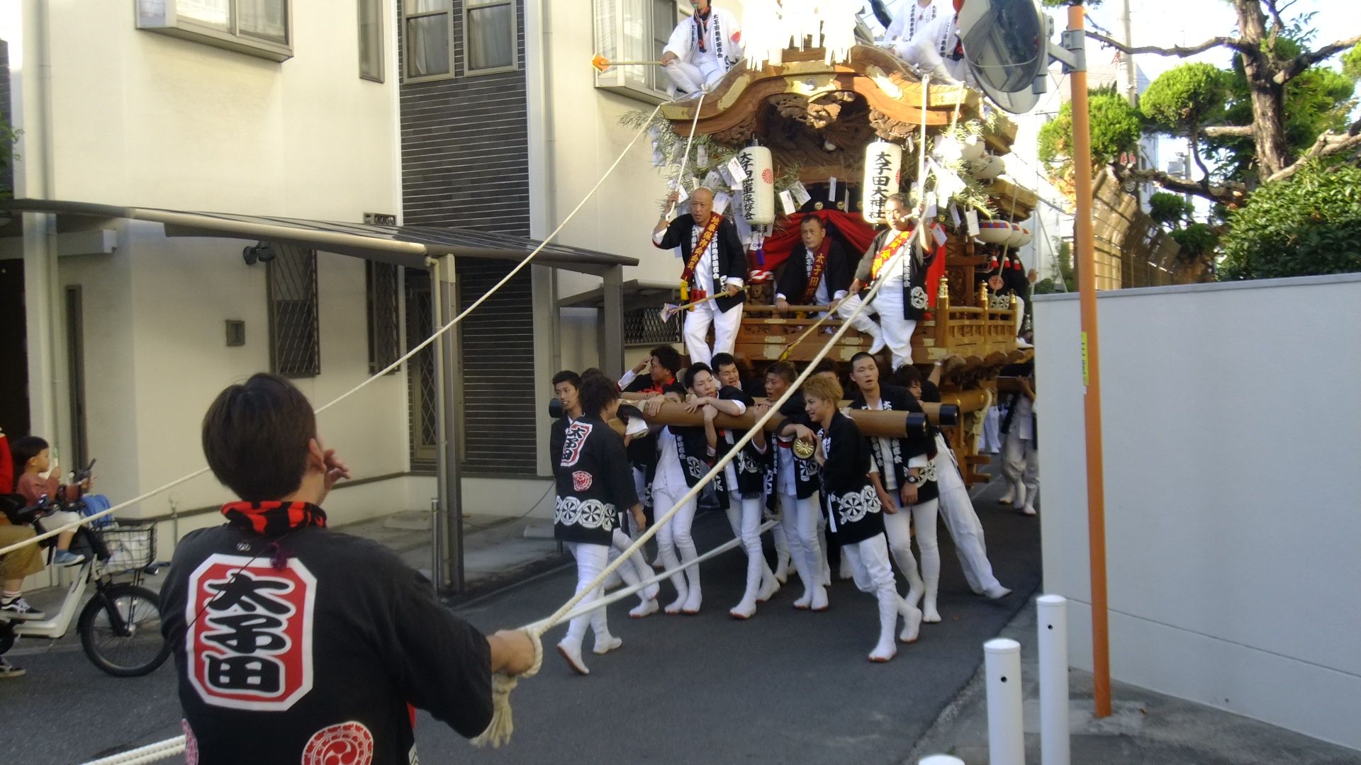 ちょうど地域のだんじりが通過するところでした。