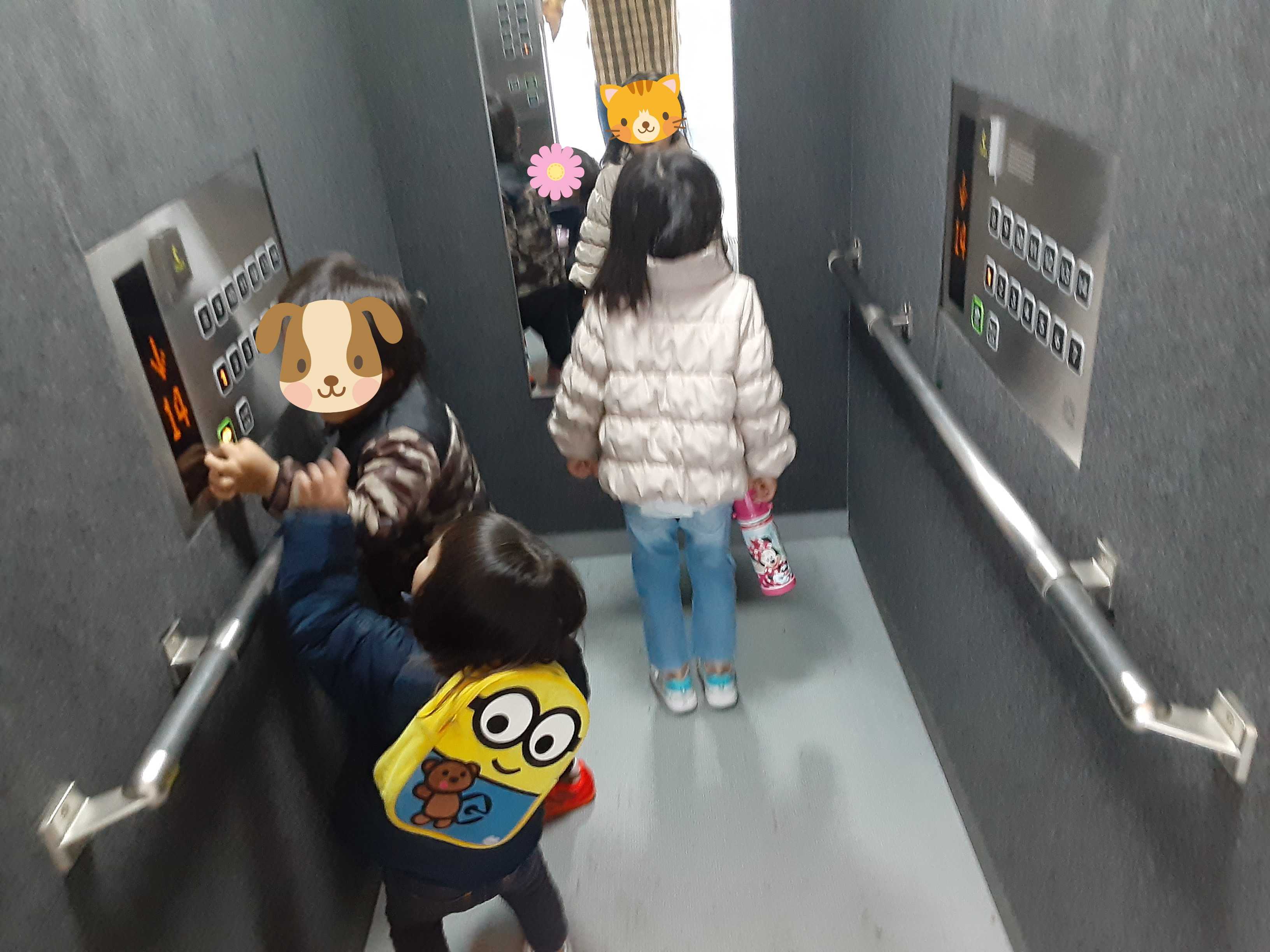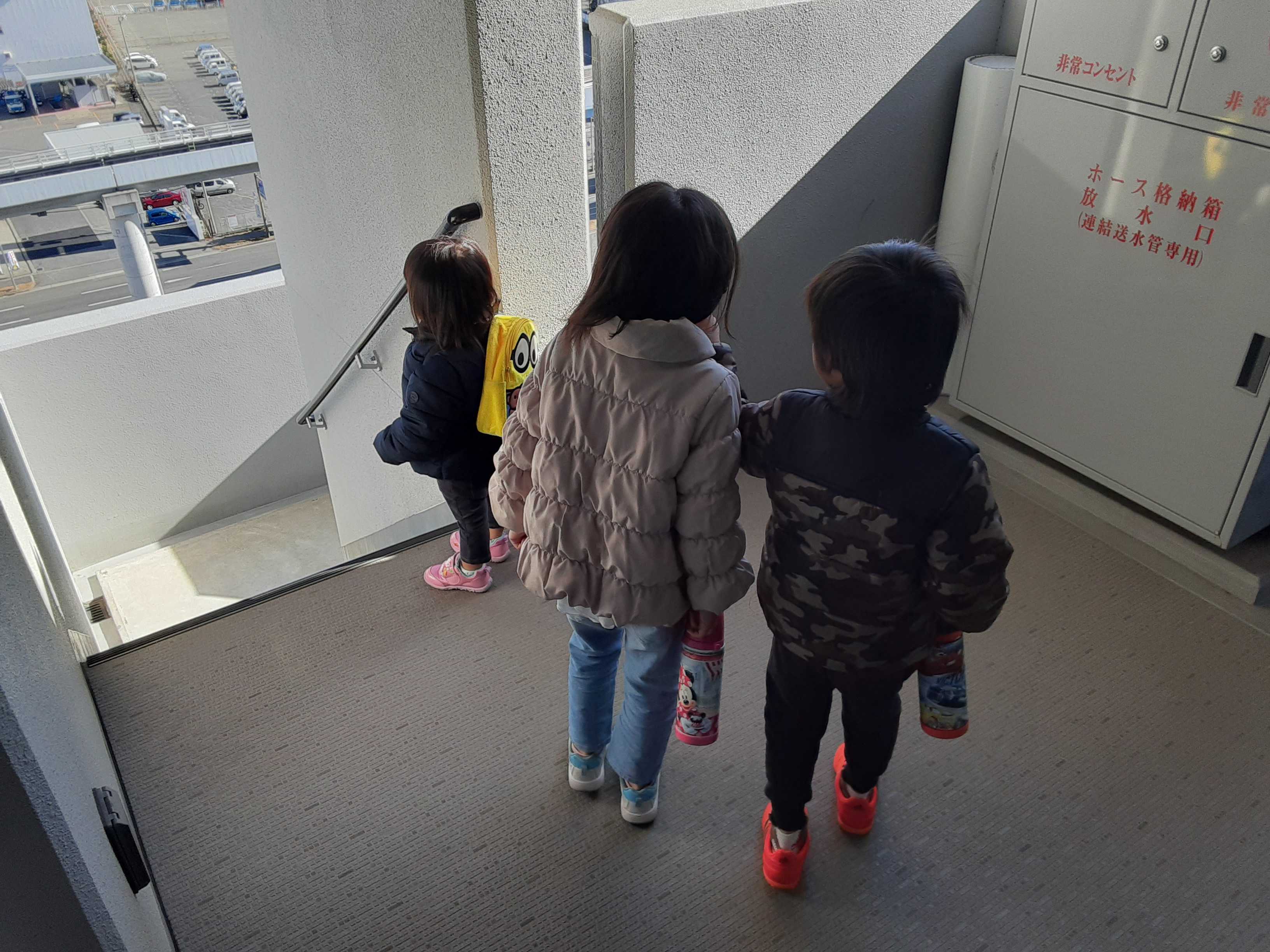 エレベーターホールまで行くと、階段で降りようかとにぃにぃたち。