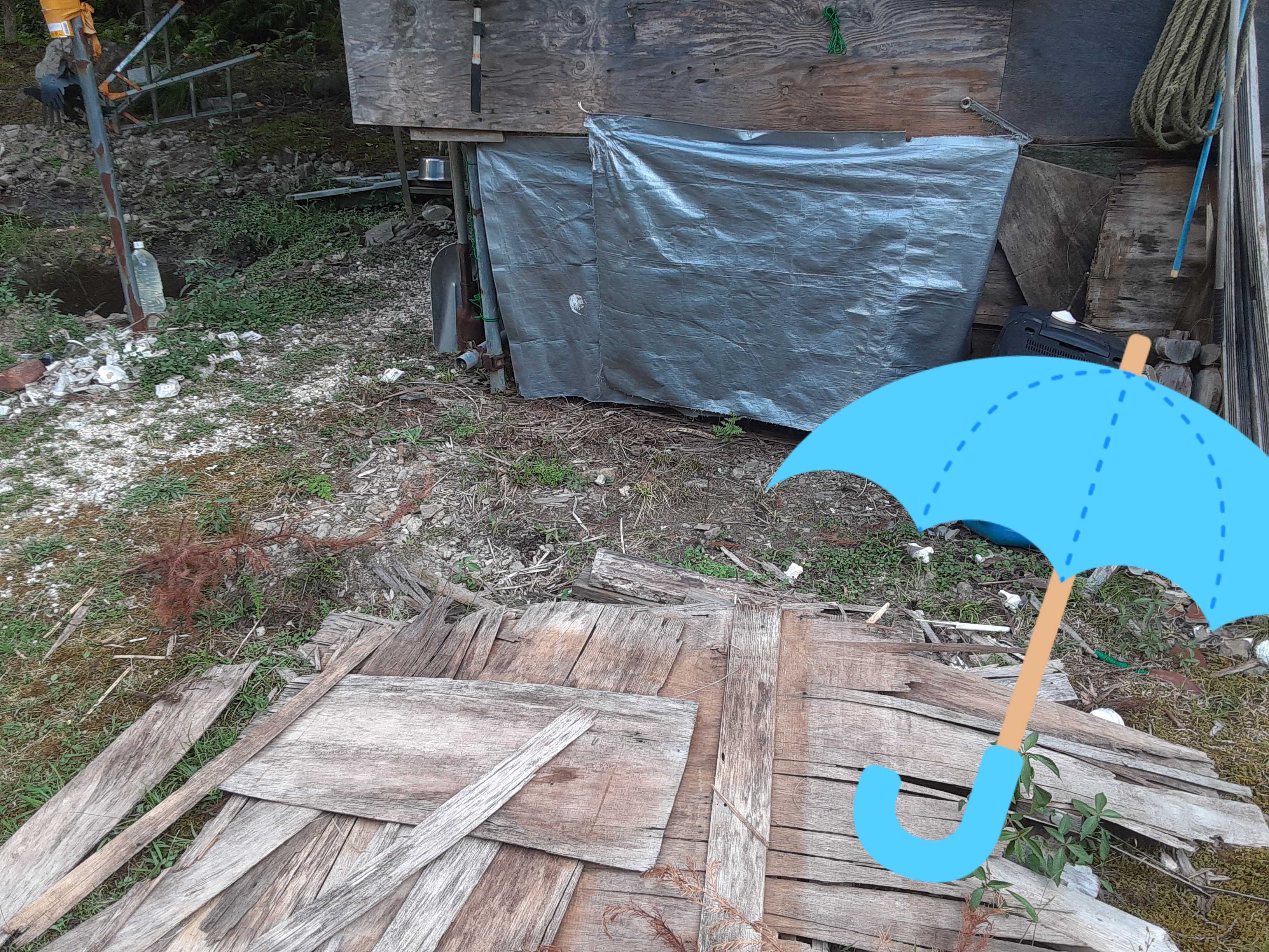 ポールをへし折った風は、作業小屋のベニヤ板も壊してゆきました。