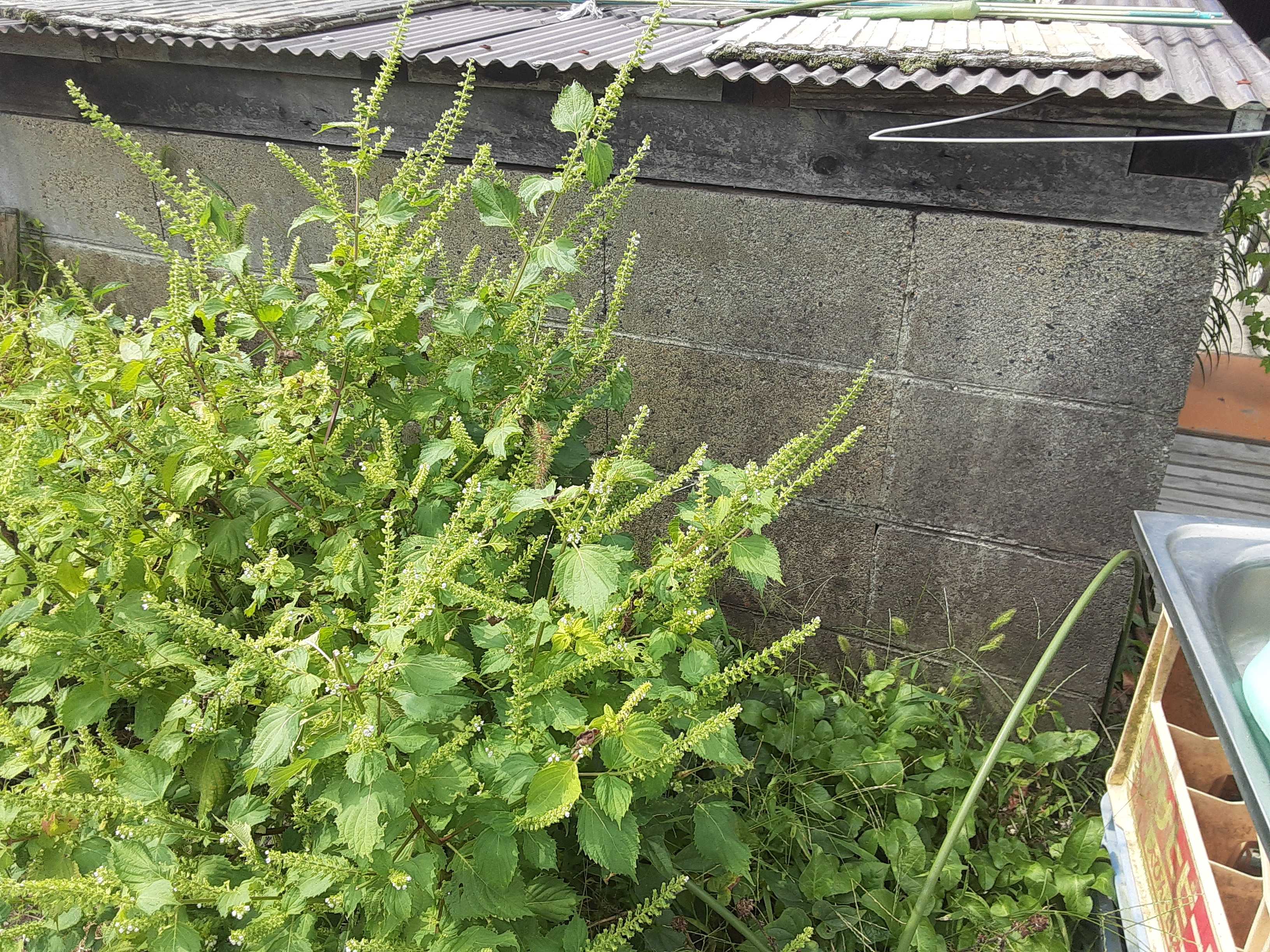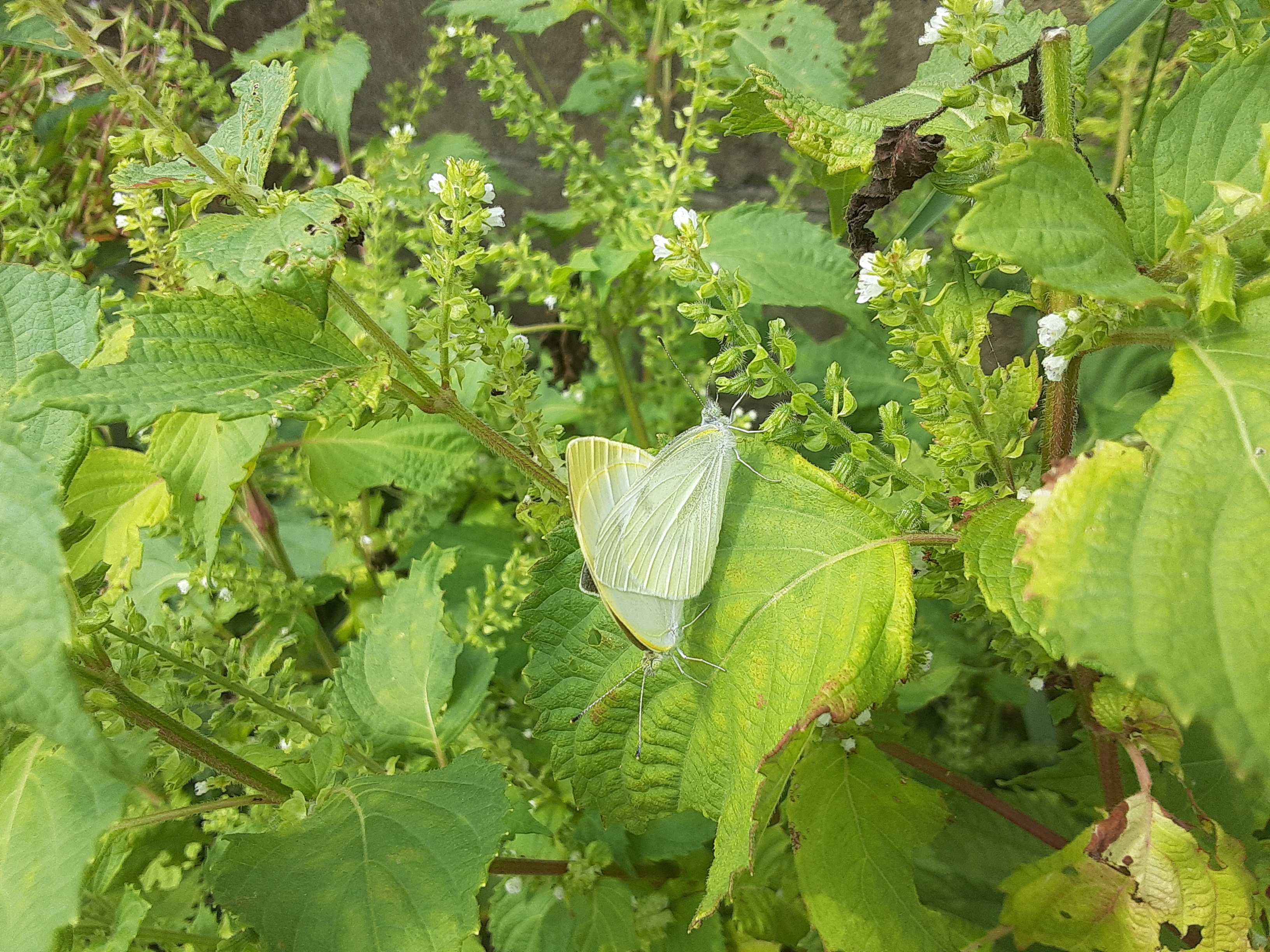 シソの実を摘んでいると、すぐそばにモンシロチョウの番いがやってきます。