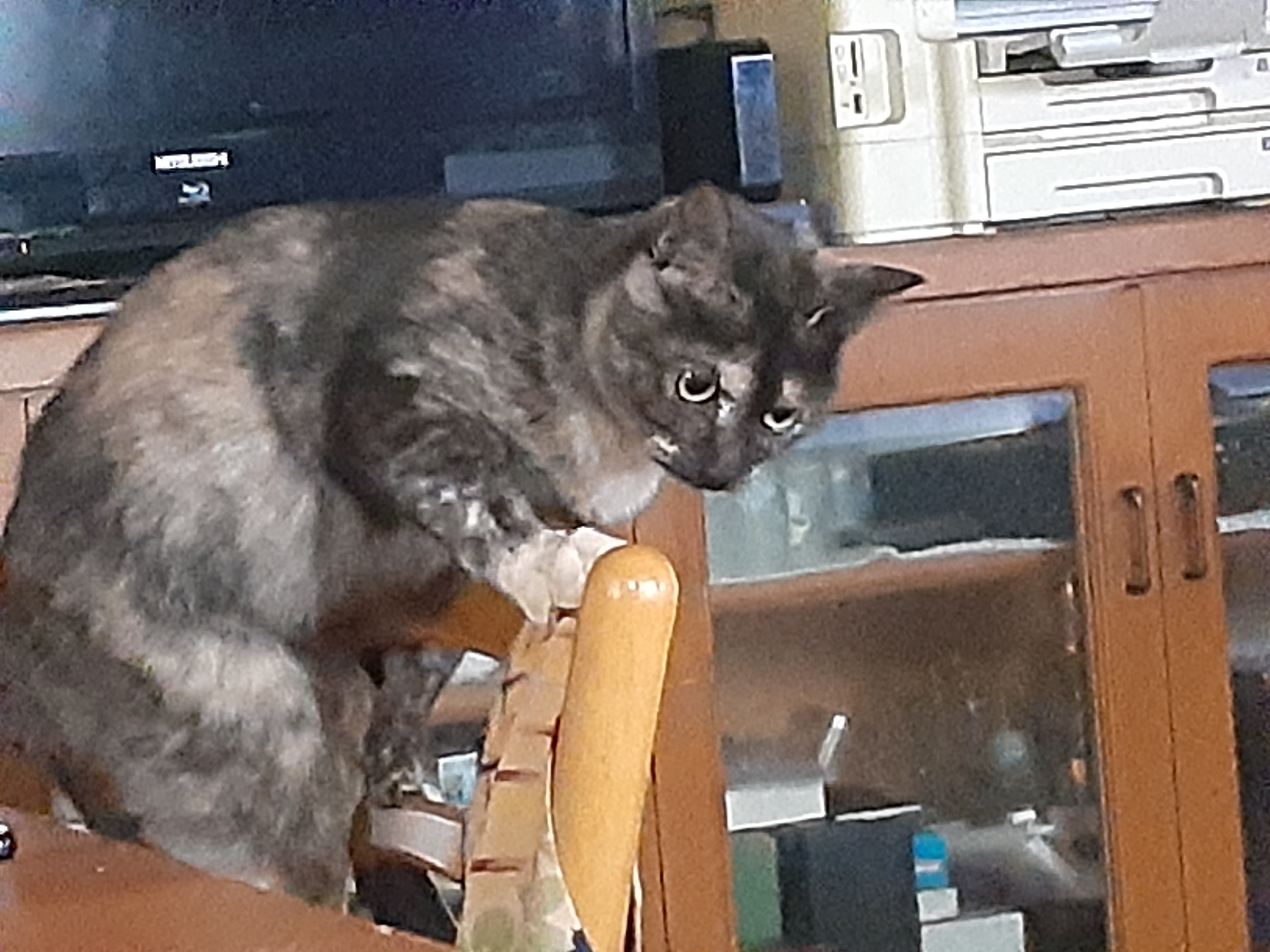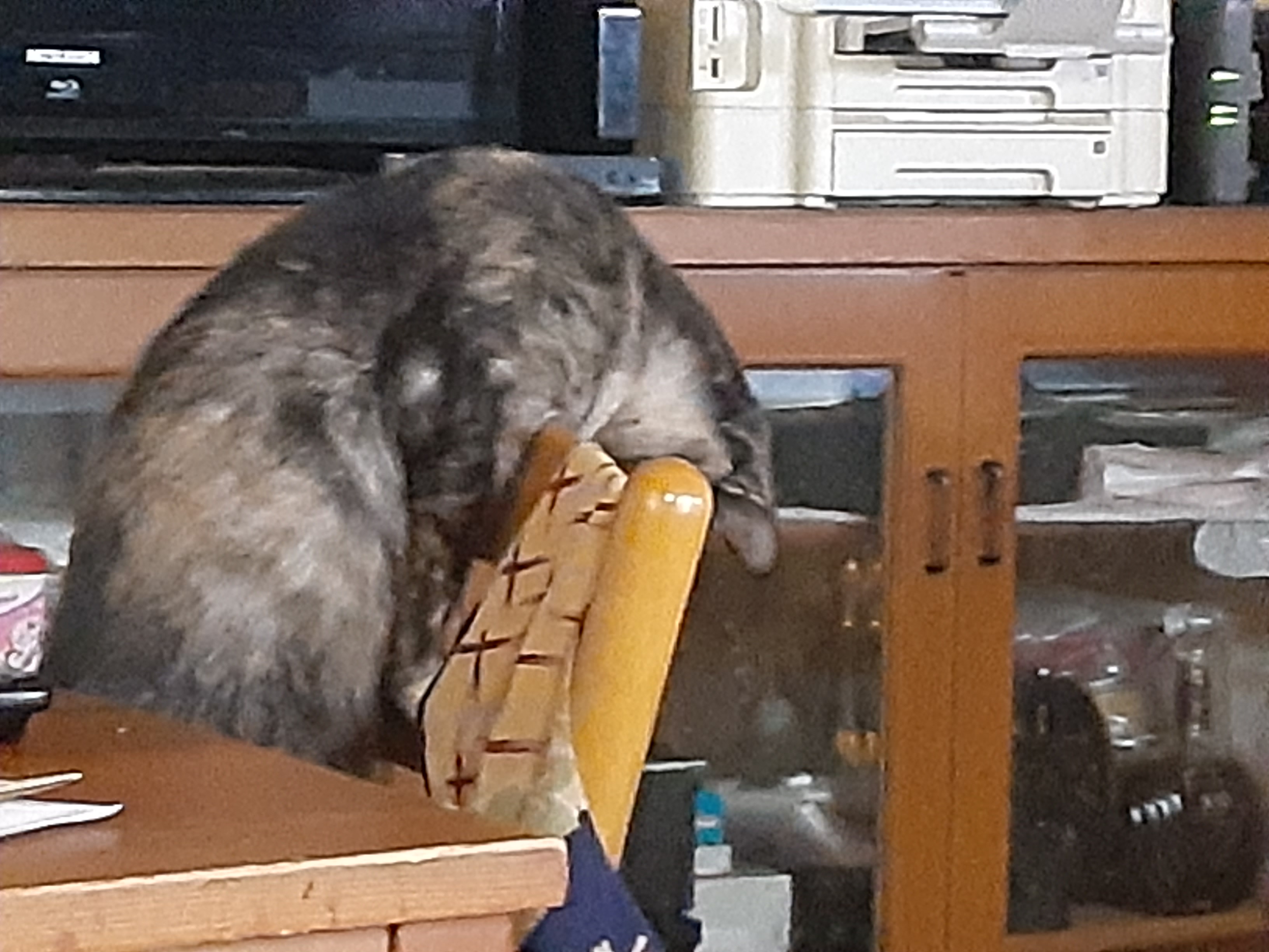 僅か2セントほどの椅子の背に登ると、背もたれの間から自分の尻尾を左右に振ってじぃ~っと見ている。