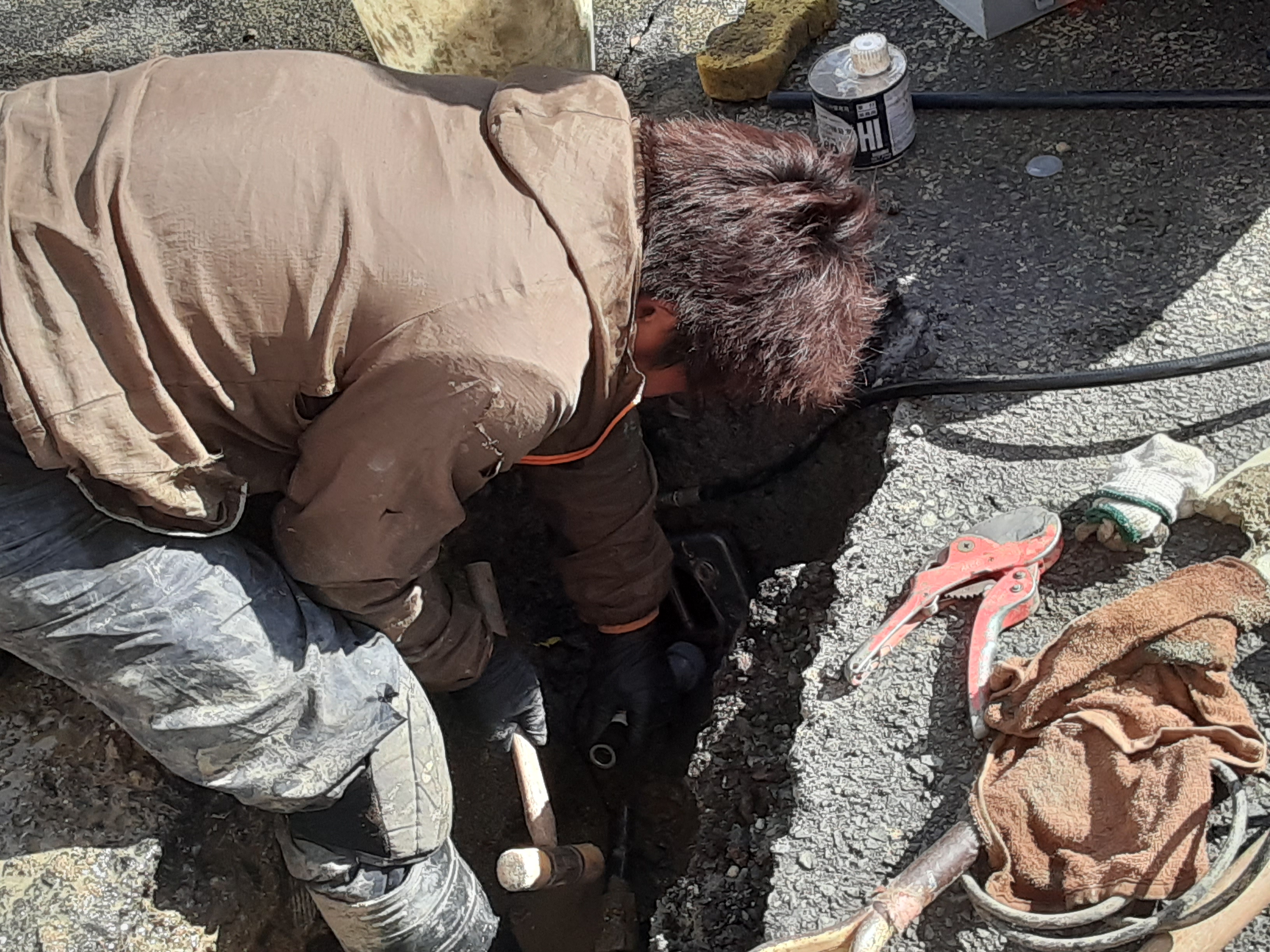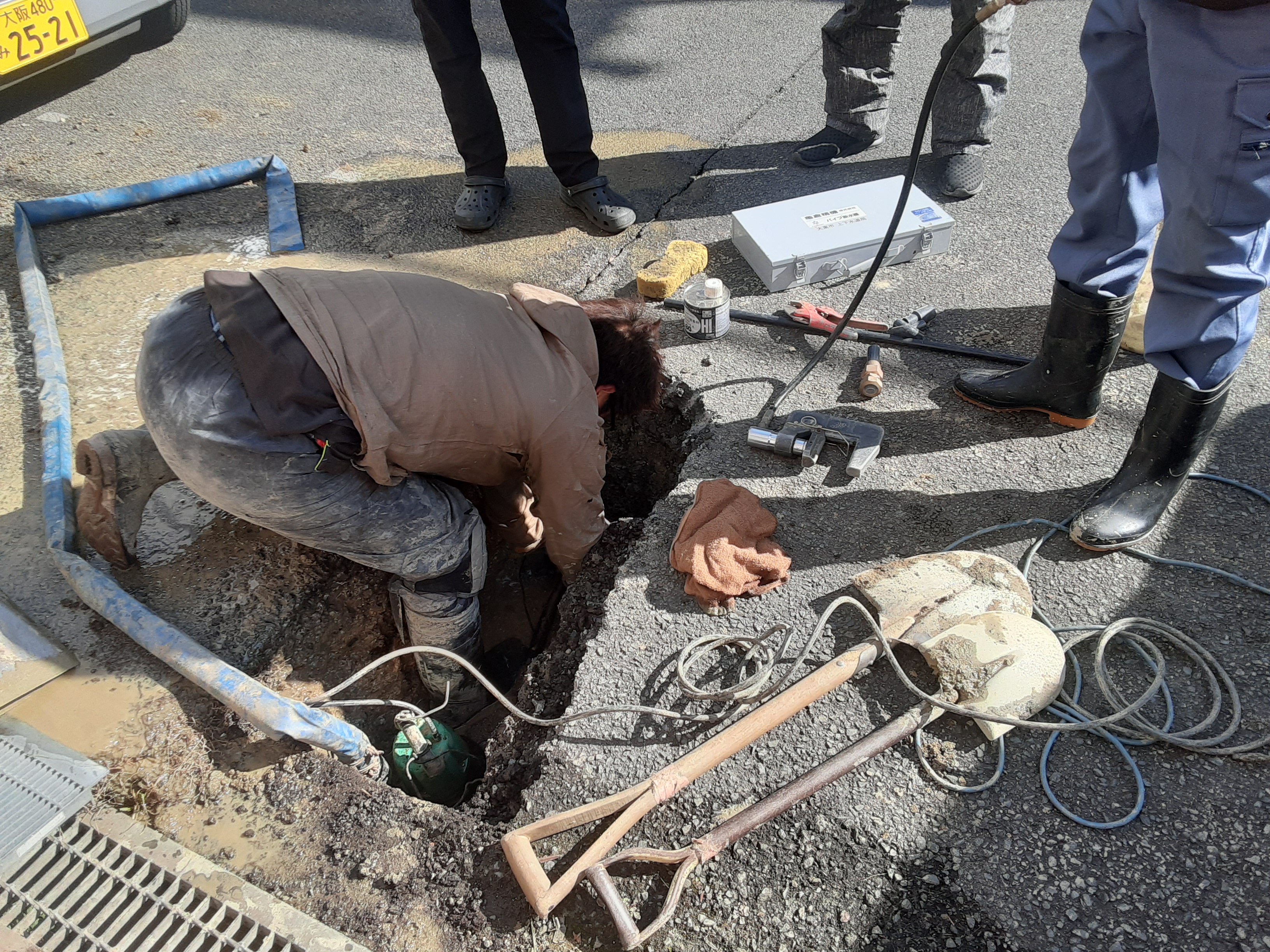 アスファルトをはがし、少し掘ると上水道のポリパイに5センチほどの亀裂が見つかり、絶え間なく水が噴出していた。