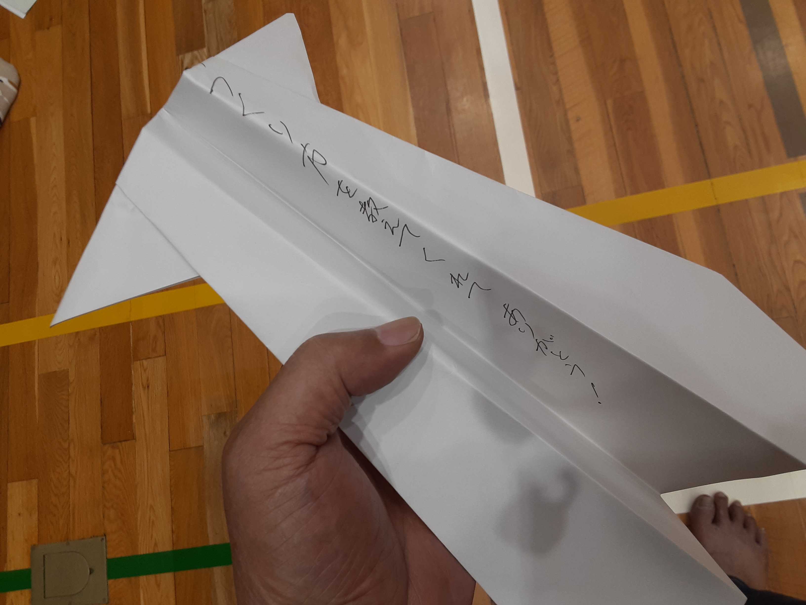 それでも楽しんでいると先生から紙が配られて、よく飛ぶ紙飛行機を作り、教えあいなさい。
