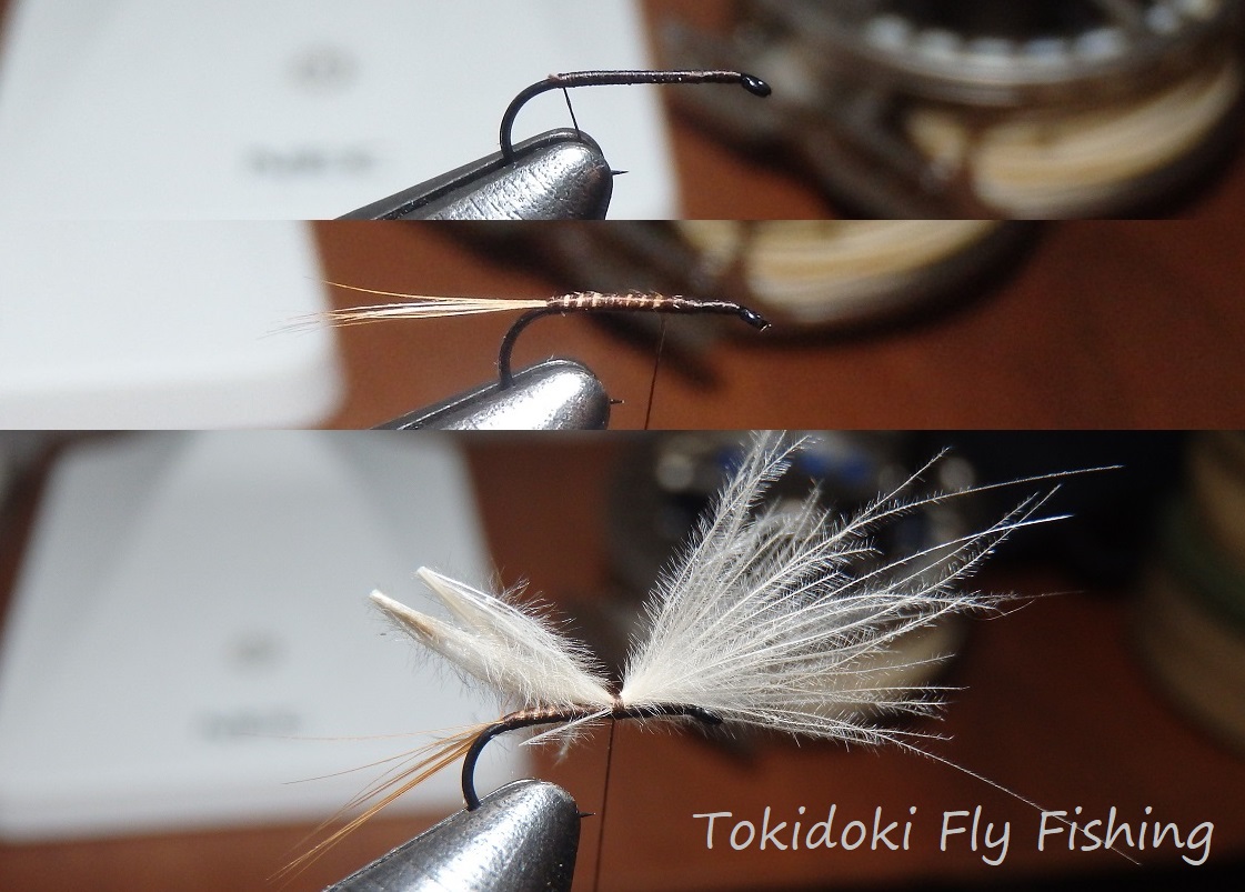 5月17日(土)また雨の日の定番ネタで、前回の釣行で最初の1尾がヒットしたフライを補充しまた。下巻き → テール → ウィング材取付ウィングの立ち上げボディー材の取付ウィングをカットして完成材料も少なく簡単なフライだけど、ライズの釣りには今回の#16を含めて各種を持っていたい。目標は3本でデンデンアマゴを1尾多分次回が今期最後のライズの釣りになりそうです。