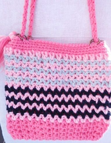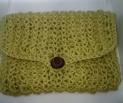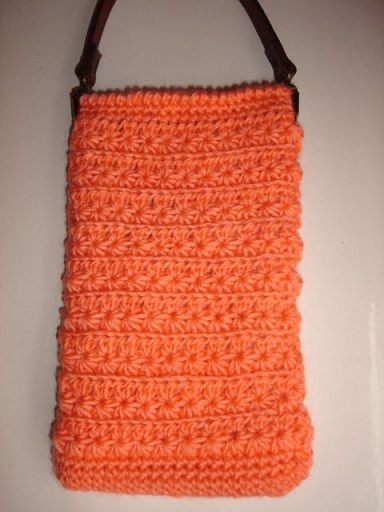 スタークロッシェ編みのスマホポーチです。持ち手は100円ショップで購入