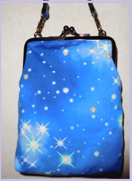 ポシェット用に購入!入れるところが二口あります。18㎝ 角型 ちょっと失敗しました。持ち手を付けると口が空いちゃうペンチで調節してみたけど硬くてだめでした。持ち手を付けなければ使えるのでポシェットじゃなくてポーチにします。☆コットンこばやし☆『starry sky』コットンブロードプリント生地/布/宇宙/星/星柄/スター/スペース/ブロード/ラメ/こばやし