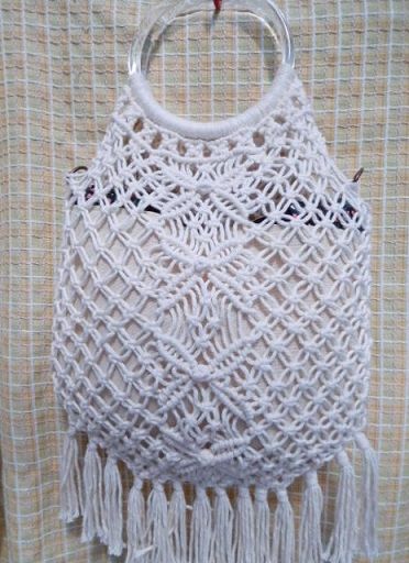 コットン生成り糸で作ったマクラメ編みのバッグです。柔らかく軽い糸です。財布を入れたら角が出てしまうのでインナーバッグも作りました。ジャスミン/プラスチックリングハンドル 2個 透明/P273S-CR【01】【取寄】《 手芸用品 持ち手・金具 バッグ用金具 》