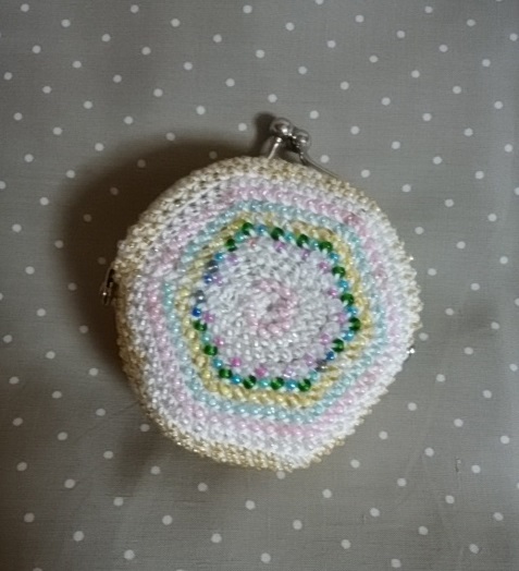 マカロンコインケース模様がちょっと下になってしまいました。反対側雪の結晶です。ピンクの段染め糸で刺したら桜みたい