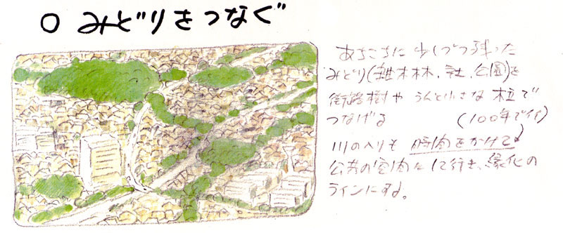 先日このブログで紹介した『第2の淵の森を保全しよう』という運動が思わぬ広がりを見せています。その後、この記事を寄稿してくださったさとうまりこさんから『宮崎さんの淵の森に対する思い』の詰まったイラスト付きの文章を託されました。みなさんにも読んでいただきたいので、ここにアップしようと思います。 所沢に住んで私が夢想すること 宮崎 駿 もうじき人工増はとまります。地価も下がるし住民が減り始める時代が必ず来ます。今から方針をたてて、乱開発でメチャクチャにしてしまった町を、なんとかしていかないと、所沢市は本当にみすぼらしい町になってしまうでしょう。以下は、散歩しながらアレコレ夢想した迷案、珍案です。○ みどりをつなぐあちこちに少しづつ残ったみどり(雑木林、社、公園)を街路樹やうんと小さな木立でつなげる。川のヘリも時間をかけて(100年でイイ)公共の空間にして行き、緑化のラインにする。○ 川辺を少しづつみんなのものに川辺のあいた土地を買上げて、少しづつうんと時間をかけてみんなの空間にしていけないだろうか。自然の土の河岸はもちろん残し、コンクリート護岸でも工夫していきものがもっとすめるように出来ないのだろうか。大工事はできるだけしたくない!○ 路地の工夫 側溝のグリーン化交通量の少ない路地なら雨水用にのコンクリート溝を道の中央にして、塀ぎわの空間を、町内ごとの責任でみどりにする。手間のかからない植物があるはず。○ うんと小さな緑地を各路地に各路地に一ケ所位は空地を確保する。公園ではなく、ゴミ出しの場所、過密の中のゆとり。散歩するおとしよりも増えているのでベンチもひとつ位。世話は町内でする。(公園にすると砂漠になるので緑地とした方がいい)○ これは過激なアイディア コンクリート税の設立家のまわり、駐車場、どんな土地でも地面をコンクリートでおおう場合、1平方メートルあたり○○円の税をみどり化のために払いつづける!(もちろん市役所も)○児童がへっているのだから学校の校庭はもっとみどりにすべき、特に裏口はなにもない学校が良い、林にできると思う。 『淵の森入り口(今の駐車場入り口)』今のまま道はぬかるんだままにする。草がよせて来て、人の通る所だけ道としてのこるようになる。・照明つけない・車だけ入らないようにする・バイクも自転車もOK・犬もOK