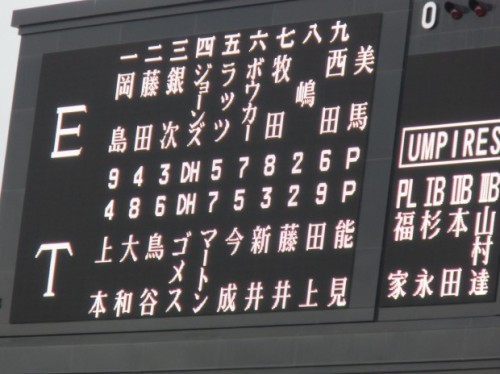 今日が交流戦の最後の試合。今年も交流戦は調子悪かったなー阪神の先発はエースの能見投手。今日の試合で2桁奪三振を達成すると野茂投手が持つ6試合連続に並ぶという注目の試合であったが・・・<始球式は世界バンタム級チャンピオンの山中選手>2回表、先頭のジョーンズ選手を四球で出した後、5番ラッツにまさかの2ランホームラン。それで終わればマシだっかが、続く6番ボウカー7番牧野に連続ヒットを浴び、8番嶋に四球を与え、無死満塁。どないなってんねん9番西田を鳥谷選手のファインプレーで1死を取ったがその間に1点。1番岡島の打球をマートンがファインプレーしたが犠牲フライでまた1点。この回は4失点。結局、能見投手は4回で降板。阪神打線は美馬投手からランナーは出すが後が続かず、結局は5-1で負けました交流戦は9勝15敗と6つの負け越し。これからはホンマに頼みます!!