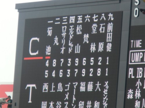 2位阪神と3位広島のクライマックスシリーズ第1戦!先発はセ・リーグ最多勝(13勝)ピッチャーのメッセンジャーと広島はなんと中4日で前田健太1番に西岡選手を起用し、キャッチャーはここ一番で頼れる藤井選手。試合はメッセンジャーは5回まで4安打を打たれるが0点に抑え、前田も毎回ヒットを許すが0点に抑え、0-0のまま終盤へそして6回裏1死ランナー無しで9月から調子を上げてきている福留選手。風は台風が近づいている影響か、浜風でなくホームラン風。少し期待して応援しているとおおおーバックスクリーンに運ぶ先制ホームランシーズン中ライトスタンドから福留選手へのヤジは相当ひどかったが、今日の歓声はすごかったな~しかし広島の応援も凄くレフトから3塁アルプスにかけて赤で埋まってたな~メッセンジャーが8回まで0点に抑える素晴らしいピッチングの後、9回は抑えはセ・リーグのセーブ王の呉昇桓がマウンドへ!オ・スンファンはいつも以上に良くなんと三者三振で試合終了!!ようやくクライマックスで勝ったー!!<ヒーローインタビューは福留選手とメッセンジャー投手>ライトスタンドは攻撃中みんな総立ちで、超ハイテンション!本来シーズン中も立って応援したいが後ろの人に迷惑になるので、我慢して座って応援しているが、今日は思う存分応援ができました第2戦は能見投手かな?絶対勝ってやー!!----------------------------------------------------おかげさまで、今回の勝利で【観戦記】で100勝目(69敗)となりましました。今までで2003年・2005年の胴上げを観戦できたのが一番嬉しかったですが、やっぱり日本一をぜひ見てみたいですね~観戦200勝目までまた14年かかるとすると、還暦を過ぎてますのでまず健康で観戦できるよう日頃の不摂生に気をつけていきたいと思います----------------------------------------------------