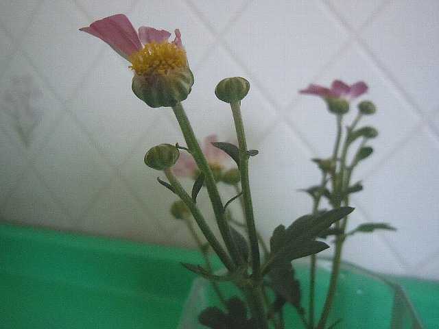 たった2週間で梅雨が明けたようですまとまった雨はあまり降らずジメジメした梅雨感がないままに終わってしまいましたきのうは梅雨が明けたと知る前に外に出た時にあれ?と思う程に朝までの空との違いを感じていました何がどうと言うのではないのですが長年の勘というか動物的な勘かないつも梅雨が明ける前から鳴きはじめるセミはまだ鳴いていませんやっと春だ もう梅雨だ いよいよ夏だ そろそろ秋だ とうとう冬だこんなふうに言い切れる季節感があるなんて本当に恵まれた国ですきょうも37℃の予報となっています ☆ ☆ ☆夏の間は仏花に 生花 を供えるのは月参りの時だけです最近は日持ちの良いカーネションを使うこともありますがやはり暑い時は 小菊 がメインになります仏壇の花器は小さいので買ってきた花は短く切ることになります切った小菊の枝にはつぼみがたくさんあるので捨てるのはもったいなくそういう枝をまとめて小さい容器に投げ入れていますすべてではありませんが小菊のつぼみは花開き洗面所の窓辺に置いてあるのでつぼみが開いてくる過程を見られるのが新鮮でしたつぼみから花びらが広がってくる過程ですがこの状態で生育が止まってしまいよく見ると切り口から ひげ根 のようなものが出ていましたせっかく根のようなものが伸びているので実験でもありませんが花壇の隅に植えておきましたどうなるのか小学生なら解かることなのかもしれませんが (^-^;