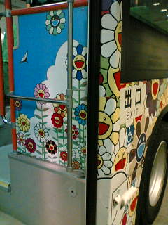 こないだ新幹線に乗っていて、物足りなさを感じた。もっとお国柄みたいなものをだせないのかな?と思ったのだ。 移動手段をあれこれ探っていた時に、高速バスのページに「黒人の女の子2人が乗って来た。どう見ても観光客。時間が限られた旅の中でなぜ敢えて高速バスで移動しているのだろう?」と書いてあるのを見た。そうだ。バスに乗るのは時間がある人だ。バスに乗る事自体を楽しみたい人だ。観光客は新幹線に乗る。飛行機かもしれないけど、狭い日本。新幹線で移動するんじゃなかろうか。 としたら、新幹線は観光客の目に多く触れる所である。新幹線は交通手段だけど、その滞在時間は観光客にとっては貴重なものだ。新幹線に乗っていることそのものを観光に出来ないものだろうか? 残念ながら私は日本以外の国の新幹線に乗ったことがない。と思う。 実は日本でだってそんなに乗ったことはない。が、たぶんどこの国の新幹線も、内装は似たり寄ったりなんじゃないだろうか?普通の電車を見る限り。目をつぶってあちこちいろんな国へ連れて行かれて「はい、ここはどこでしょうー!」と目を開けさせられてて、新幹線の中だったらそこがどこかわかるだろうか? シンプルで無機質な室内は、たぶん無国籍で観光とは対照的な位置に属している。 そこで、なにかお国柄をだしたらどうだろうか,と考えた。 さっきから私は,座席の前のネットをじっと見ていた。前の座席の後ろ側に、雑誌などをいれるネットがついている。あれはただのアミアミかと思いきや、よーく見ると1本の紐から構成されているのだ。1本の紐を計算ずくで編むことでそれはシンプルで美しく無駄のないネットになる。職人業だ。 そのネットが造り出される行程を思い描いた。この枠、このねじのハマる穴、この紐。それらがそれぞれ箱に詰め込まれて並んでいる。おばさんだかおじさんが、マニュアルに応じて枠に紐をアミアミする。「これが新幹線の座席に付くなんて想像もつかないねー」と話している。 アミアミ張られた枠が、また箱に詰められて運ばれる。座席にネジでつける人がいる。 それが、今,私が見ているネット。職人業。 ただ、せっかくの職人の業もこれでは最低限に押し殺されていて、よほど澄まさないと見えて来ない聞こえて来ない。敢えてそうしているのだから。 それを、前面に押し出してはどうだろう? ネットを、座席のカバーを、荷物入れを、ドアを、洗面所を、ガラスを、職人業まるみせにして、日本の地域性をありありと見せたらどうだろう? 私のイメージするものは、吉田鞄×京都の織物のコラボレーションだ。黒いしましまのシリーズ。さりげないけど伝統工芸だ。 六本木に行くバスが、村上隆ものだった。外観がタカシ柄なのには慣れている。昔たかしパーティーに参加して、すごく引いてしまった。あの隆。私もコスプレしていけば楽しかったな... なんと、乗ってみたら中まで総タカシ柄だったので驚いた。天井までタカシ柄だ。このキャラクター達は好きじゃないけど椅子は可愛いと思ってしまった。 なにしろ六本木ヒルズが隆にジャックされているのだ。隆好き故に六本木ヒルズに行く人だっているのかもしれない。それならばこのバスは手段でなく目的にもなりうる。このバスに乗りたいからこのバスに乗る。普通の都バスなのに観光名所だ。 これはしてやったりだな、と思った。してやられた。 どうか、もっといろんなものに蔓延させてもらいたい。勿論タカシ柄や、アニメーション文化でなく、「手段を目的に」運動を。