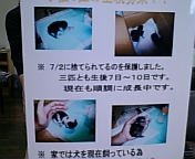最近、捨て猫がおおいですね!犬は結構取締りがきついので、野良犬は少なめになっているみたい!地域によっては多いですが?ネコはひどいですよ!あちこちで繁殖をつずけていますね!友達の家に子猫です!チラシをつくって引き取り手を捜しています!可愛いですね!いい飼い主がみつかって欲しいですね!またまたもう一人の友達から、ネコいらん?と言われました!裏庭に、なきじゃくる子猫が!この友達は観念して、動物病院へ!病気もっていないか調べてもらいに!まだ小さすぎて、調べられないとの事!しかたなく、のみとりをして帰ってきました!飼う決意をしたみたいです!