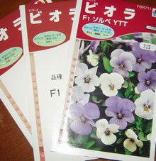 たまたま2年前の「趣味の園芸」8月号見ていたらパンジー、ビオラの種まきは8月中旬から下旬と記載。さっそくビオラのタネ選択あれもこれもで悩み、3種類に決定手配(沢山種まきしたいが小庭で置き場所が・・・。)・ 今年もこれだけは欠かせません 白系から青色系に変化していく様が楽しい ソルベYTT ・ この種は初めて”ももか”シリーズから 左:うみももか 右:わいんももか 色合いはもちろんユニークな顔がお気に入り!・ タキイネット・・・ 御訪問ありがとうございました。宜しかったらポチッと↓クリックお願いいたします。にほんブログ村人気ブログランキングへフラワージャンル別ランキングエクステリアフラワー 花束 アレンジメント 鉢花 ブリザーブドフラワー 花苗 バラフラワーアレンジメント、資材花材 寄せ植えDIY,工具 総合ランキング市場トップ・