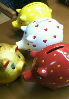 今日も下呂へ・・・おみやげ物屋さんを見ていると(+かなり試食(^^♪)たくさんの豚を発見思わず3匹連れて帰りました(笑)金の豚にもお友達がいっぱいできたので、お金がどんどん増えるでしょーーーこの豚の貯金箱いろんな絵柄の種類があって本当に迷った!!顔はあんまりかわいいって感じじゃないんだけど・・・柄はいっぱいかわいくって~集めちゃいそう(笑)楽天にも売ってるんだ!!迷うでしょ??