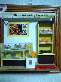 16cm角の額の中に、12センチ×12センチのミニチュアのケーキ屋さん。キットで1200円くらい。いつも、暇をもてあましている愛娘にプレゼント学校では、ドールハウスくらぶ細かい作業が、大好き。紙粘土でも、時々、パンやケーキを自分で作っている。最初は、とっても喜んだ。彼女は、初めてのことをする時は、失敗したくないからか、必ず人をあてにする。説明書さえ、読まずに わからん と 怒る今回も、同様。私も、出かける用事があったので、簡単に説明し、取りあえず、出来る所だけすればいい。わかる所だけでいい。少々、間違えてもかまわない。・・・と言い残し、出かけた。帰ってくると、とても、ご機嫌。自分一人でも出来ると、思ったか、自分なりの、応用も利いたか・・・結局、彼女一人で、2日足らずで完成。「どうだ、すごいだろ」 と彼女「ほほぅ、やればできるじゃん」 と母いつも家で遊んでいる姉にプレゼントしたと、息子はふくれっ面、今度また、埋め合わせするからね