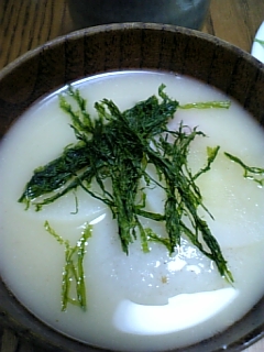 ひっさびっさの 餡もち雑煮ですぅ昨日、お友だちのお家でいただきましたさぬきのお雑煮は餡もち雑煮この衝撃の事実を知ったのは20代前半、銀行員の頃・・・その時の私は・・・ うぇ~~~~いや~~~ん ↑注:小島よしおではありませんだってお味噌汁の中に、餡もちが入っているんですよ~~~うぇ~~~~っでしょ時が過ぎ・・・25歳で結婚。嫁ぎ先(高知)のお雑煮は『おすまし』仕立て。実家と、ほとんど同じ味30歳、讃岐に移住。一姫の通う幼稚園で、友だちも増え、「餡もち雑煮食べたことある?食べに来ん?」「えぇ~~~~」「おいしいよ~。おいでよ~」 おおぅ・・・いよいよ、この時が当日、恐る恐る口にしてみる・・・( ゚-゚)( ゚ロ゚)(( ロ゚)゚((( ロ)~゚ ゚ 目がポーンうまい(^~^) 美味じゃのうそれからというもの・・・すっかり虜に昨日いただいた餡もち雑煮は、カツオ出汁仕立て。濃い目に出汁を取った後、輪切りの薄切りにした大根と人参を一緒に煮る。餡もちもその中に入れ、やわらかくなるのを待つ。白味噌(多め)を溶きいれる。器に持ってから『糸青のり』を上に散らす。↑ この糸青のりも美味しかったですよ。そして、餡もちのアップ以前頂いたのはいりこ出汁仕立て。今回は、カツオ出汁仕立て。どちらも、おいしかったです
